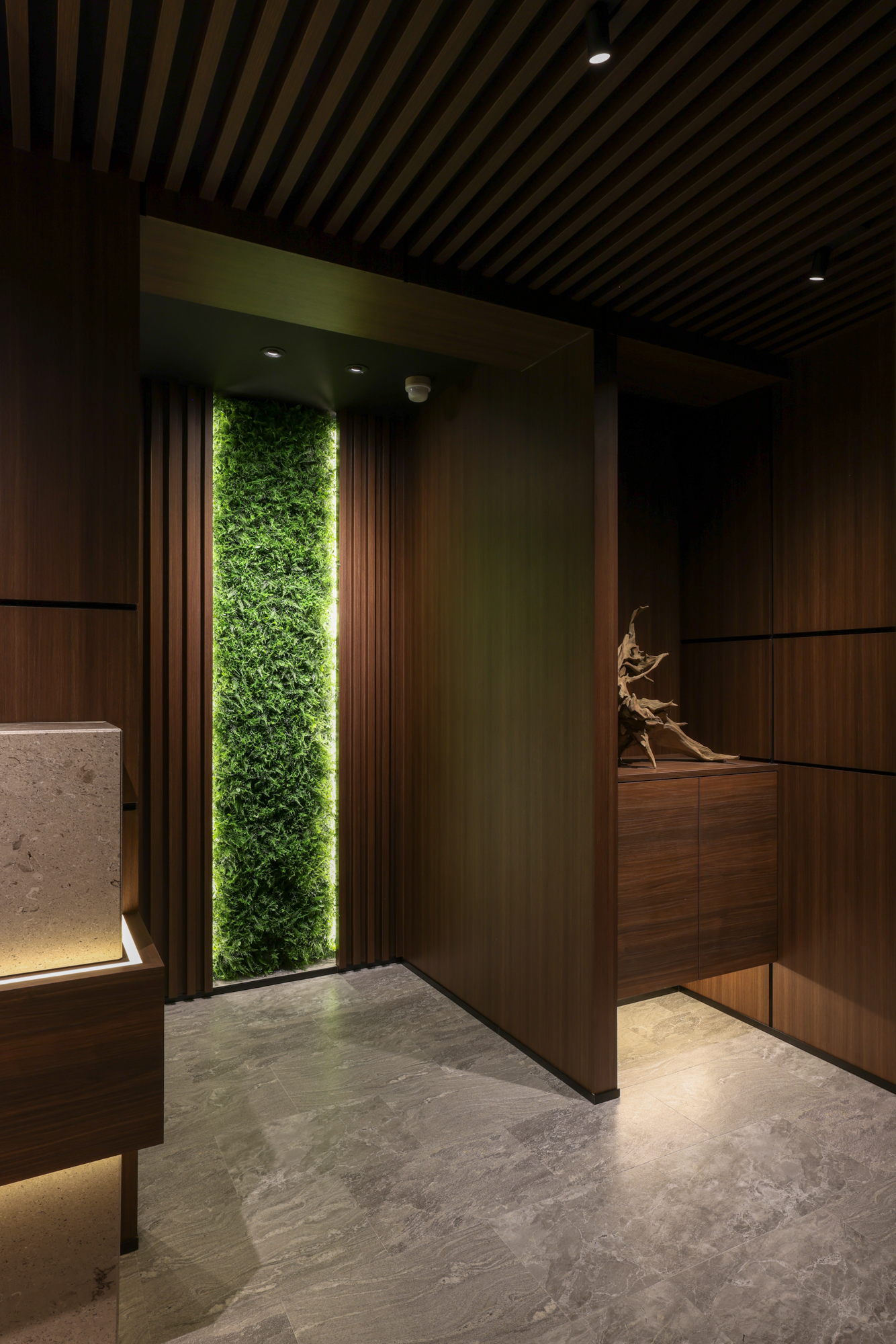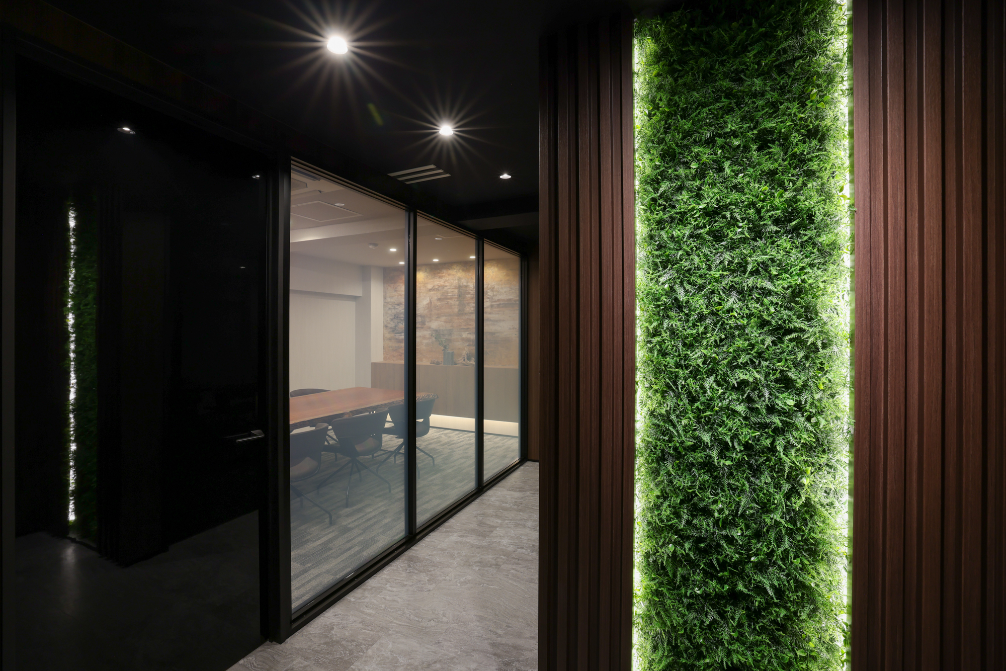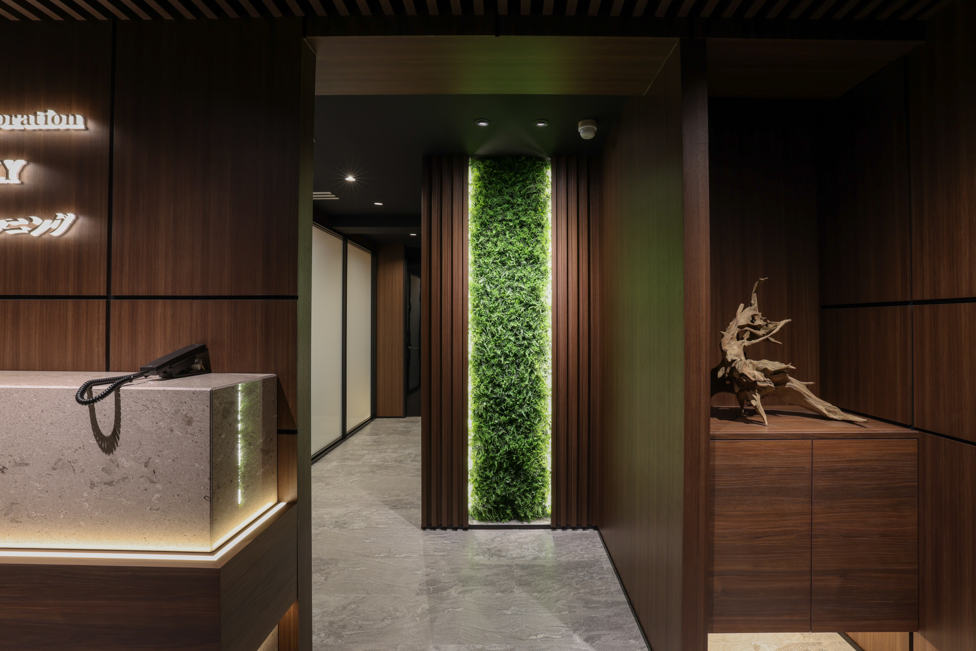 エントランスには大理石を使った受付カウンターを設けました。廊下には、グリーンウォール、ガラスパーテーションを介した空間が広がります。