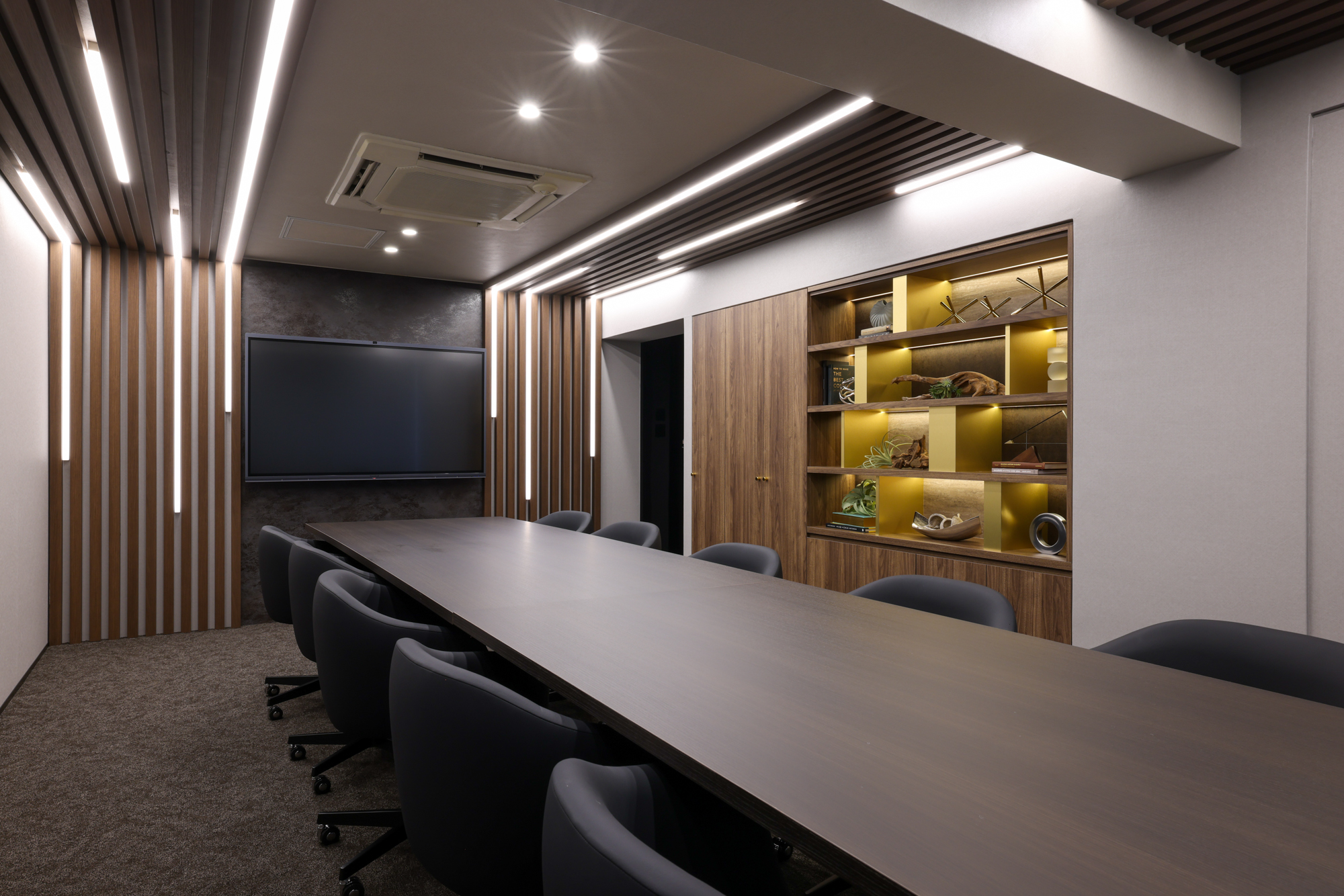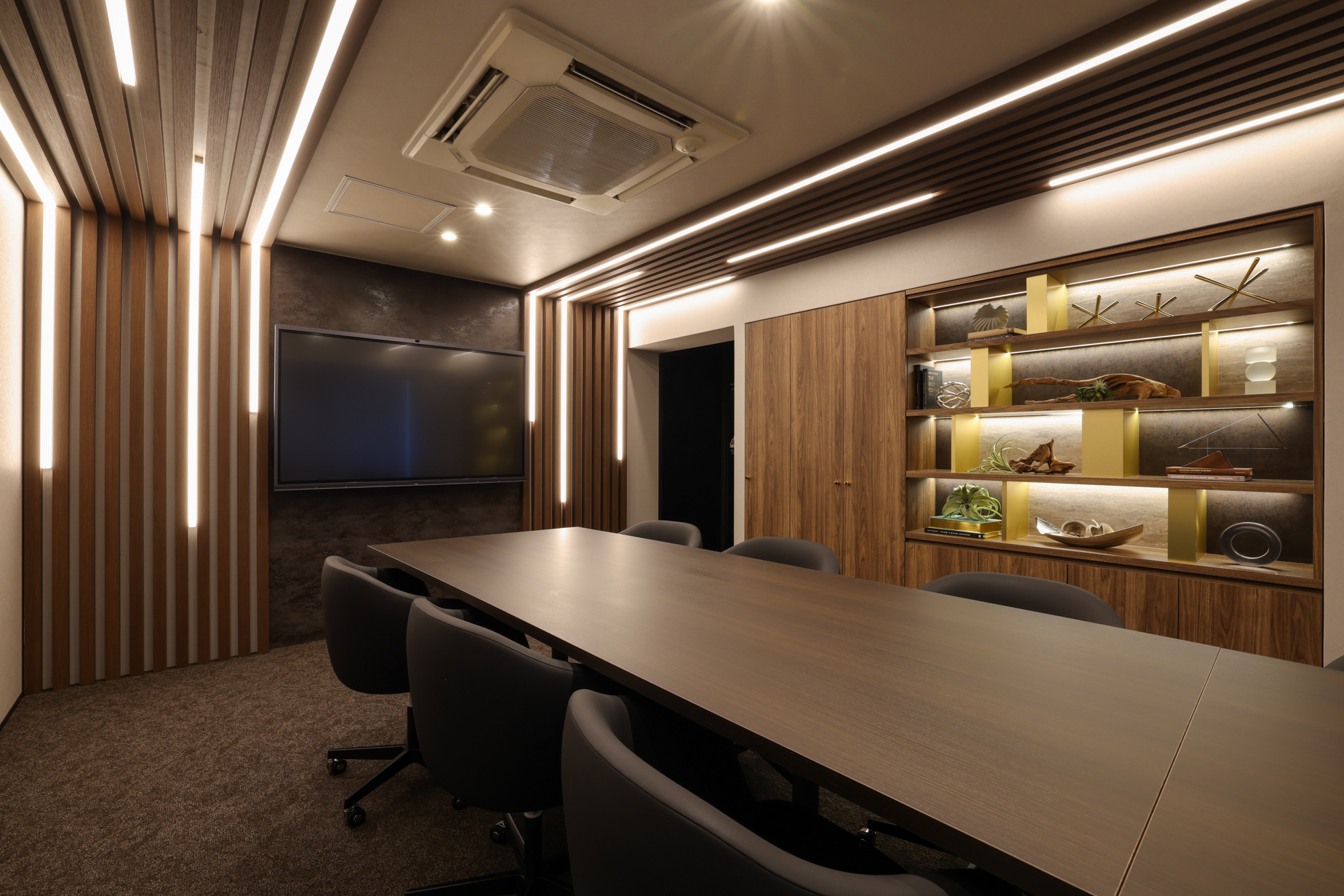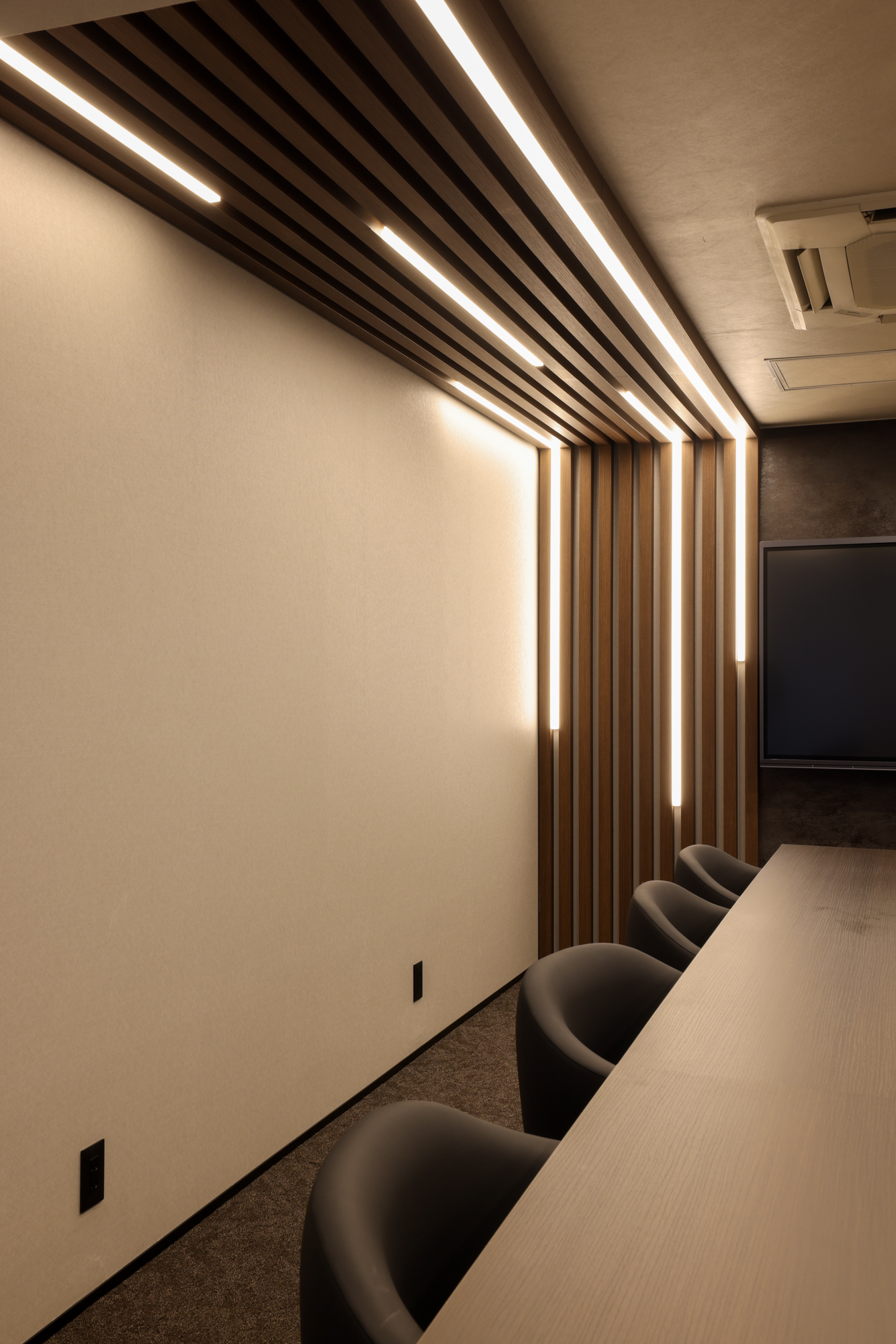 10人掛けの商談スペースには、天井から壁面へとライン照明を大胆に施し、スタイリッシュな印象へと。