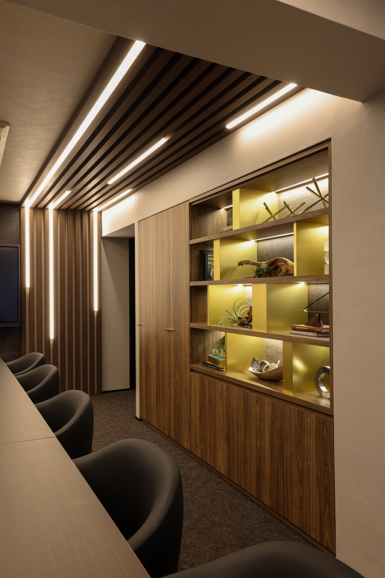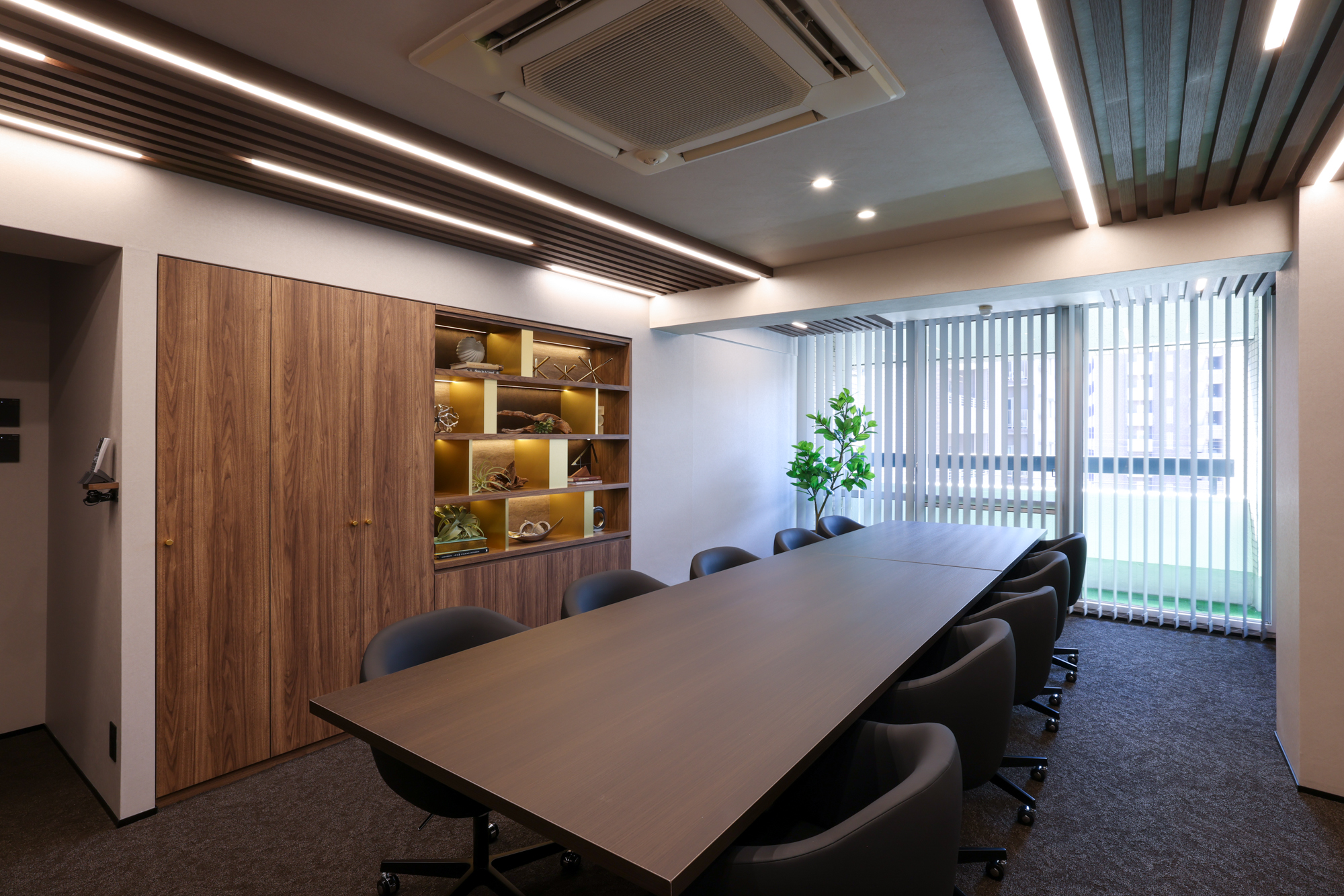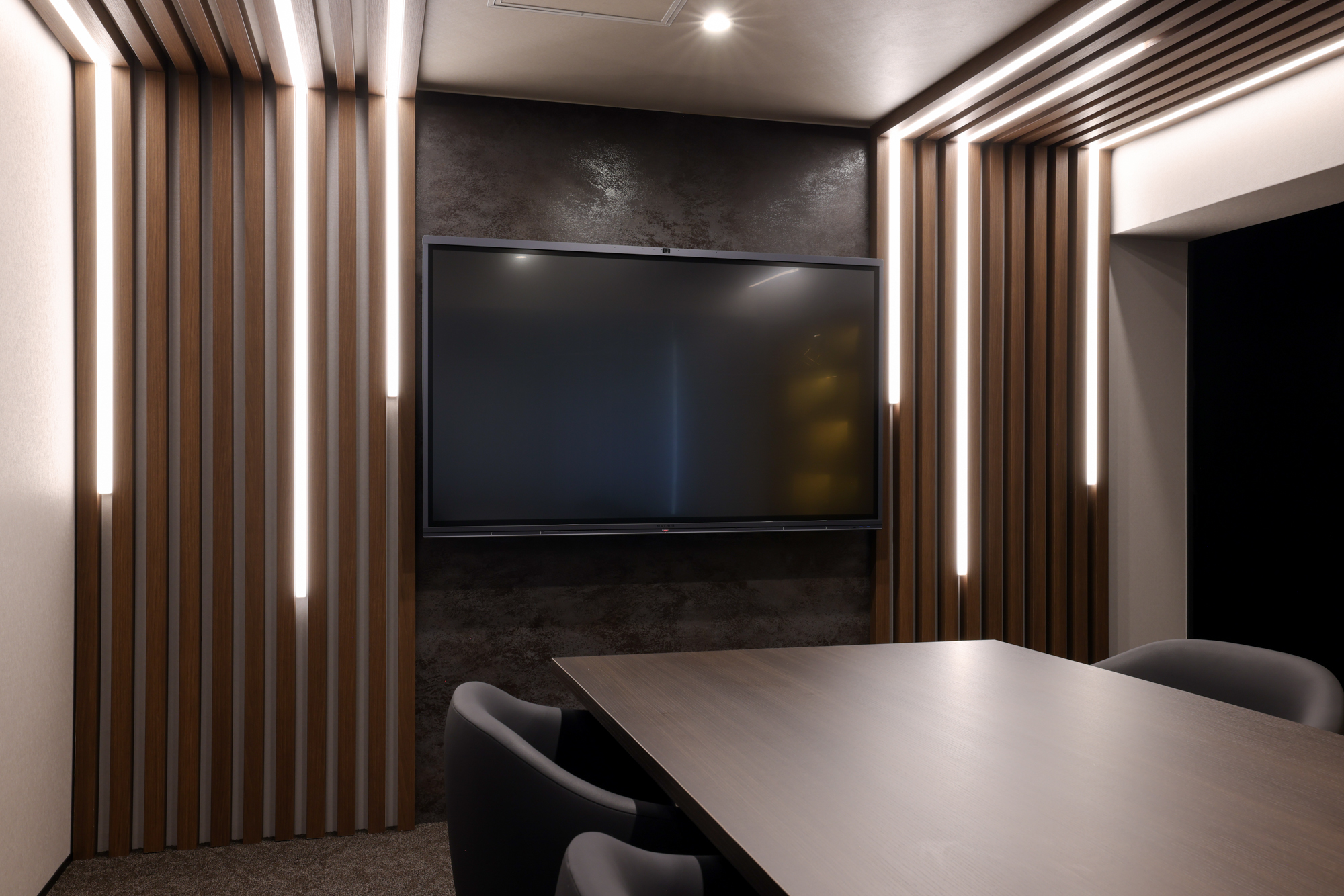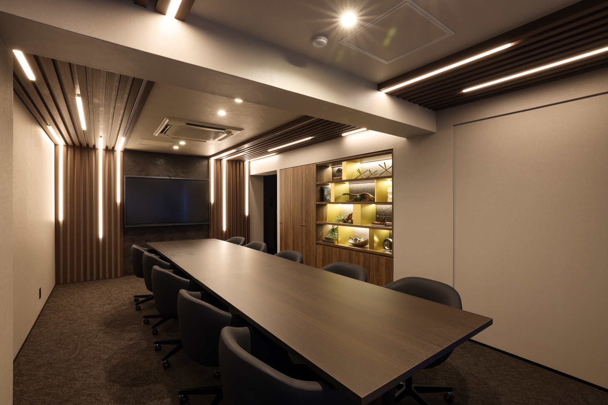 10人掛けの商談スペースには、天井から壁面へとライン照明を大胆に施し、スタイリッシュな印象へと。