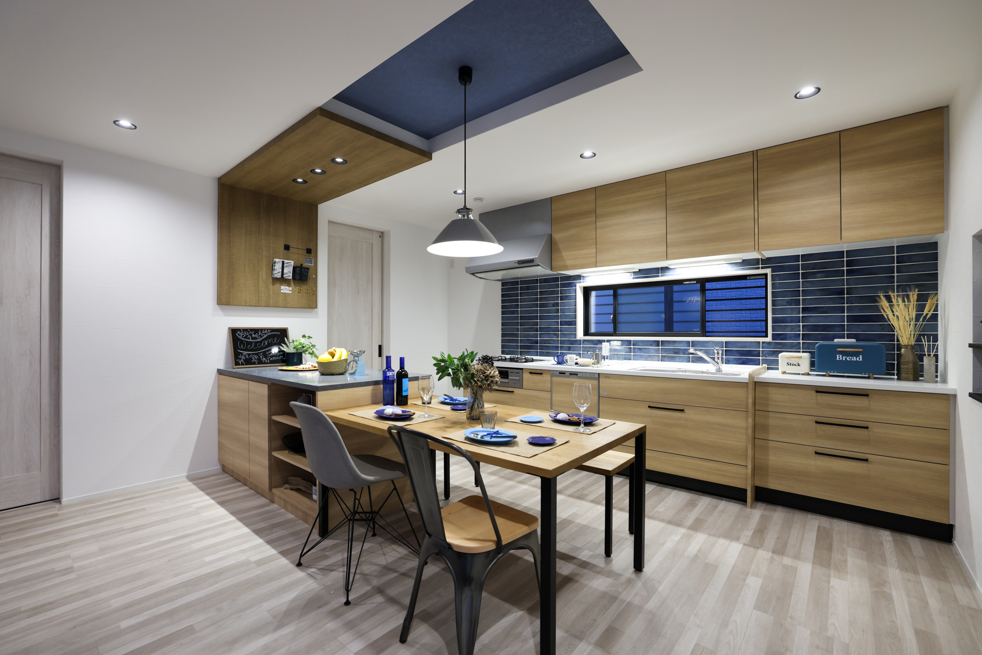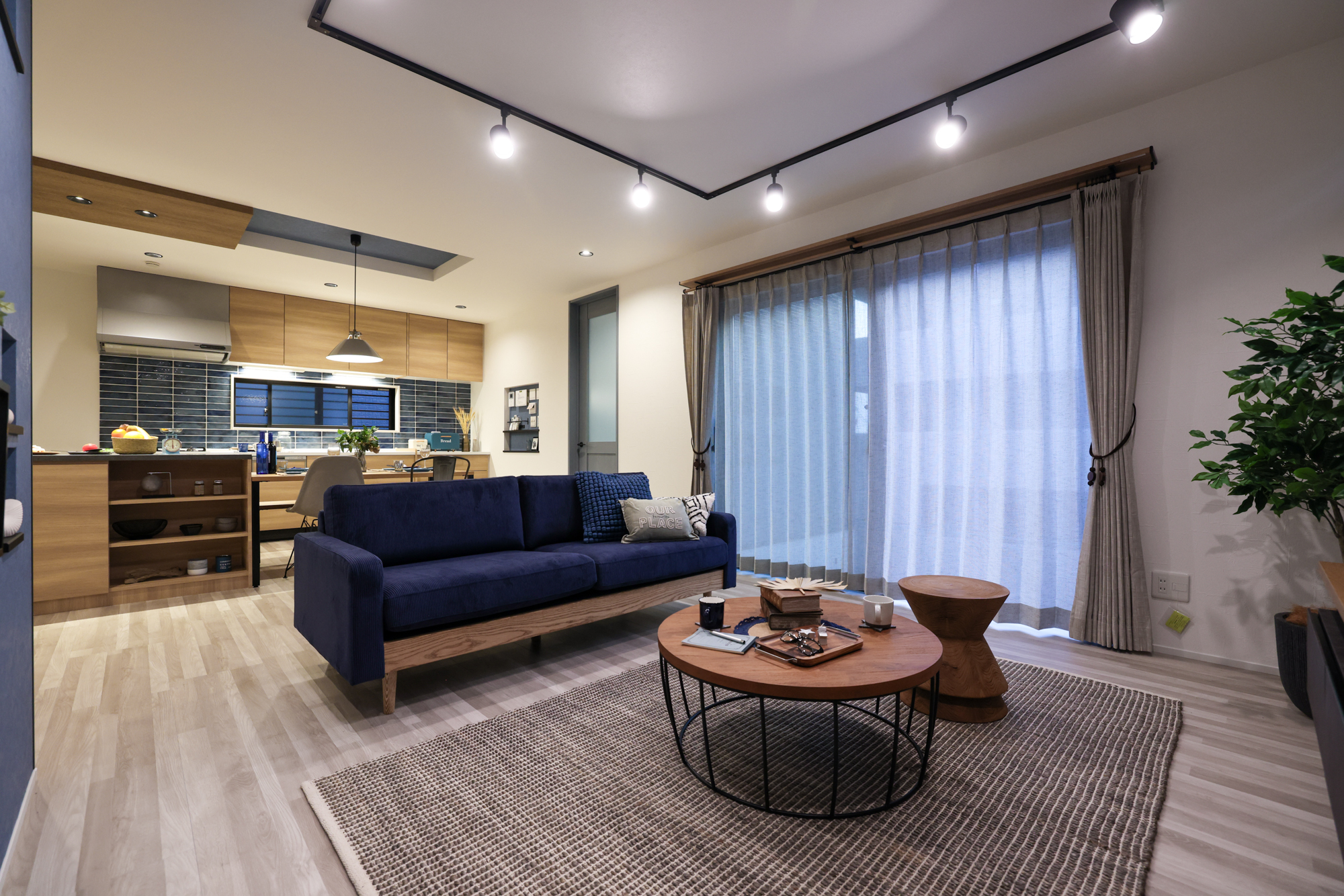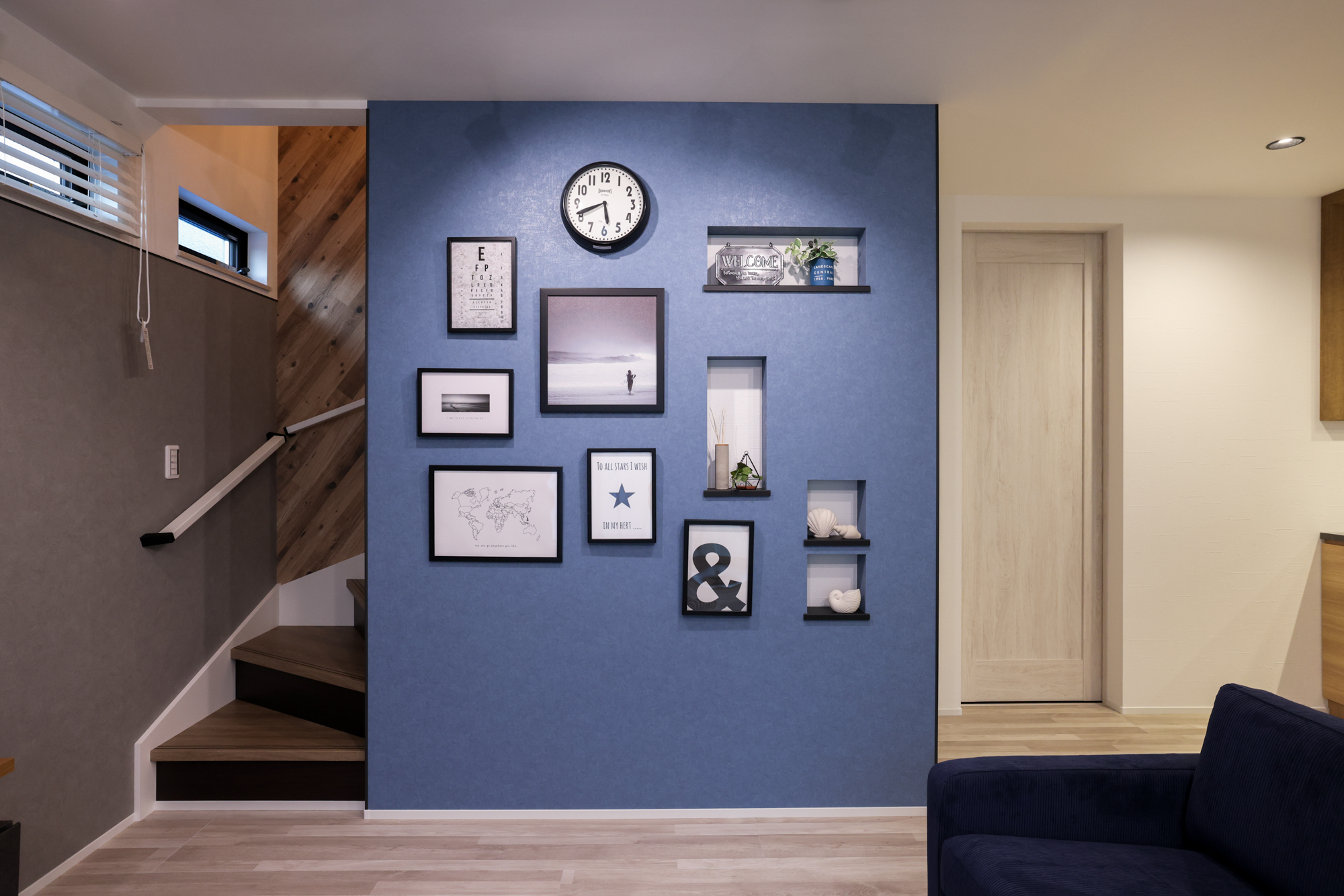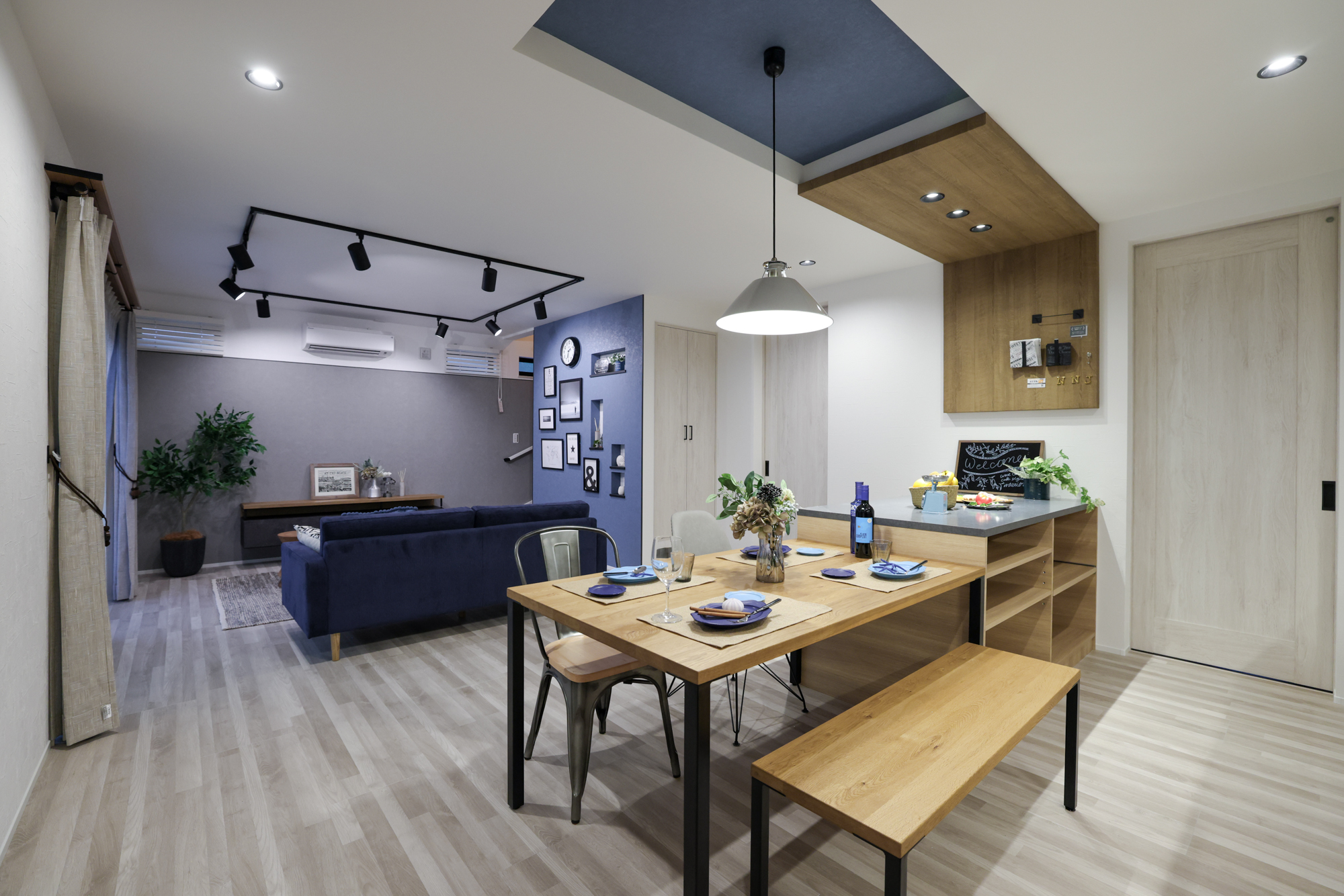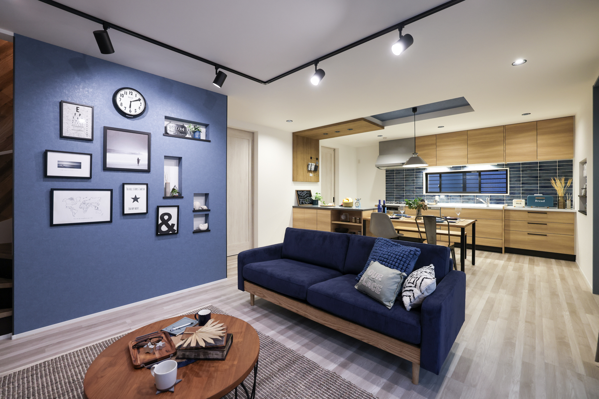 西海岸カフェスタイルのモデルハウス。ネイビーブルーとオークの木目を取り入れたカラーコーディネートをしました。