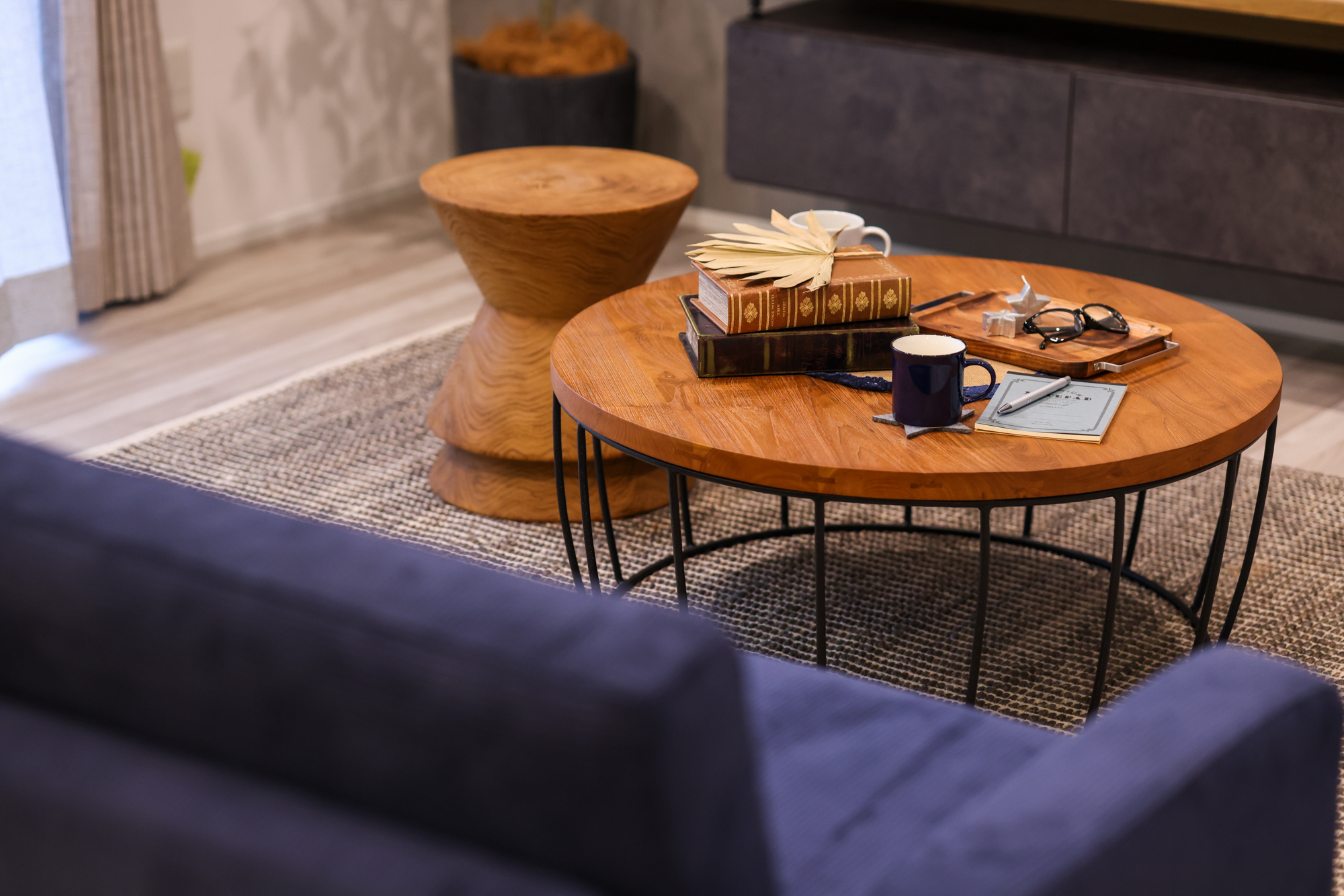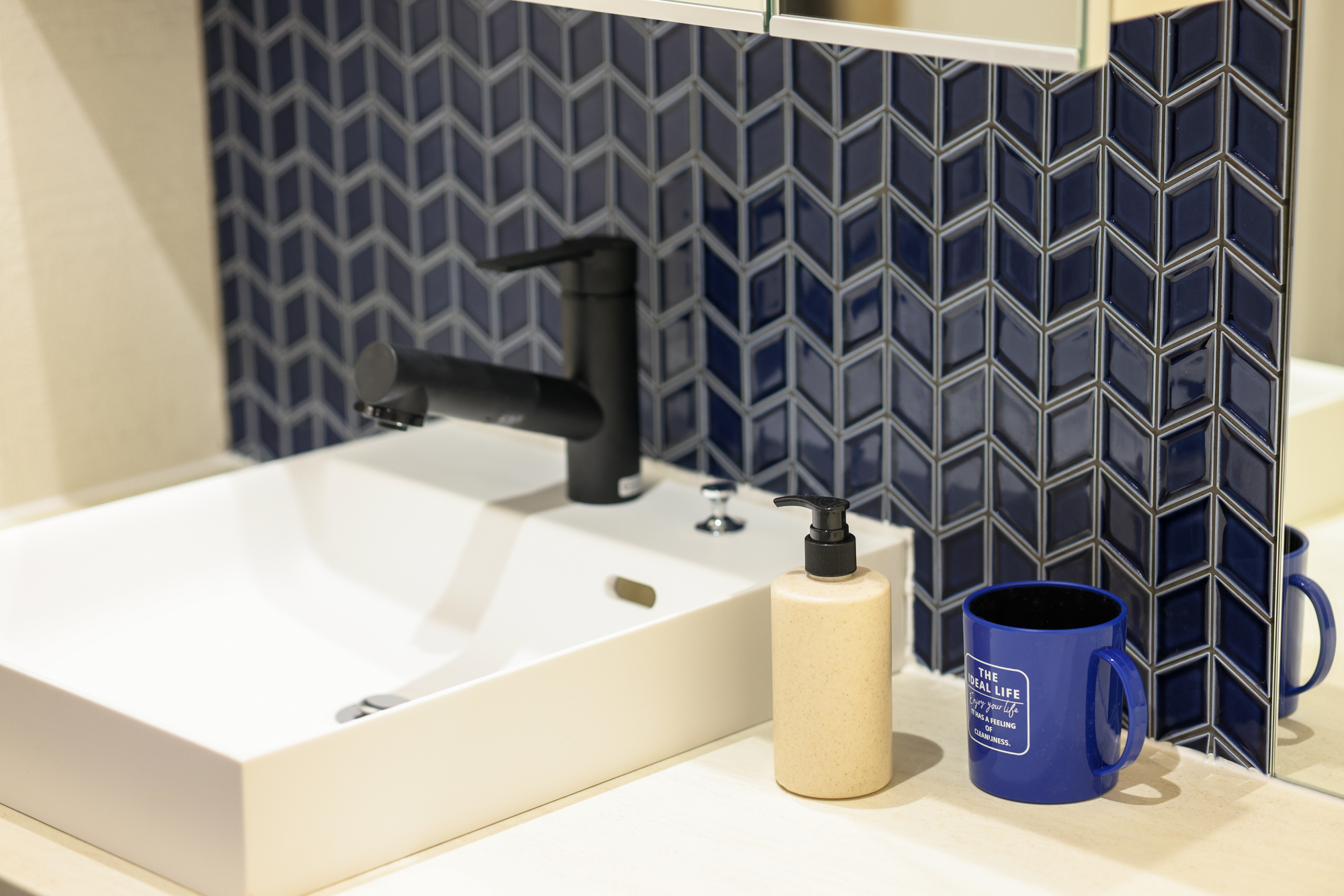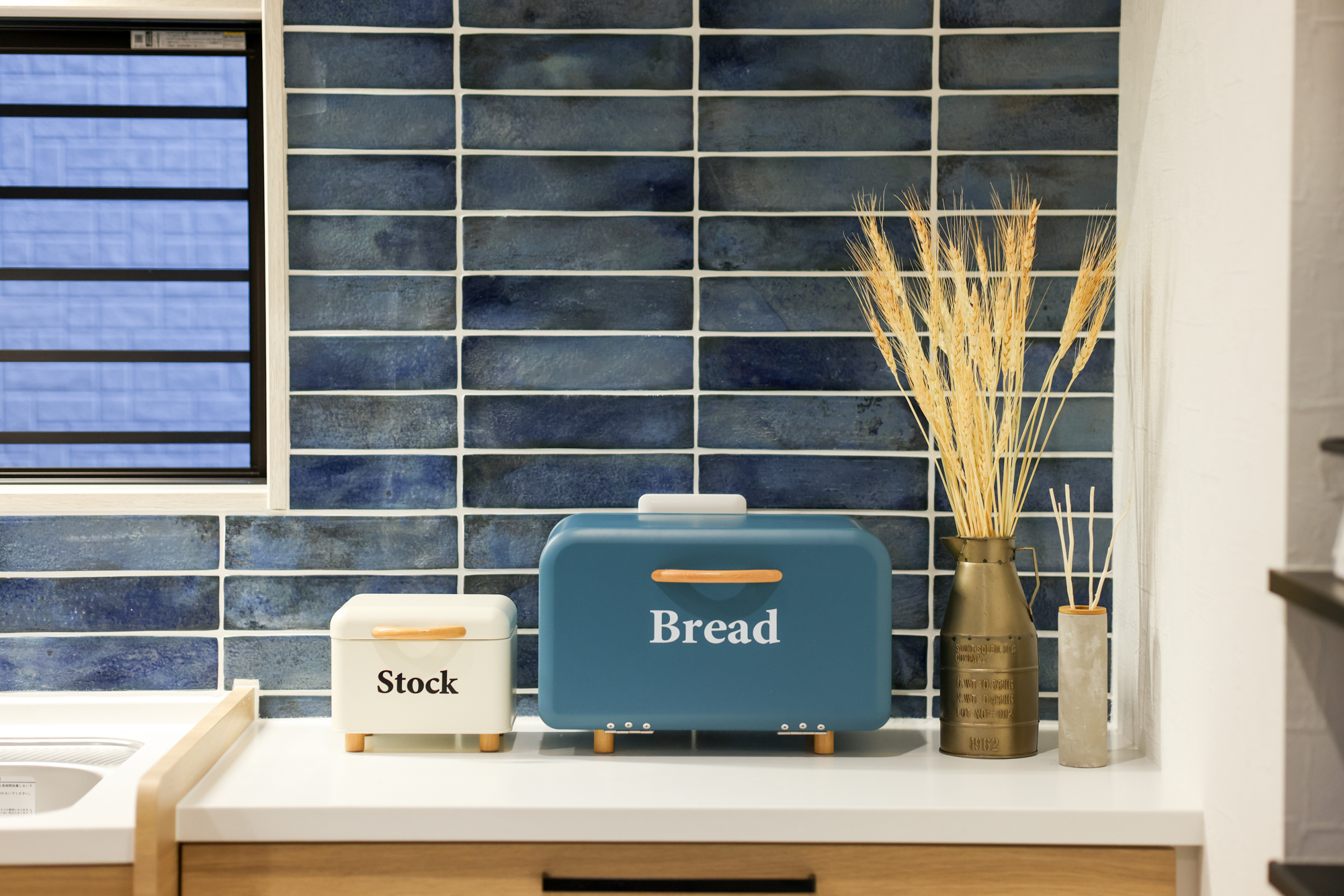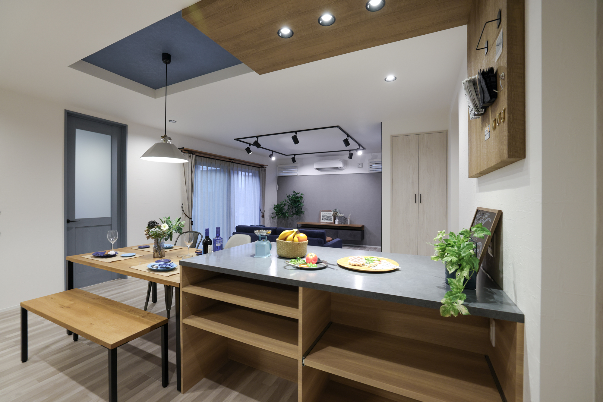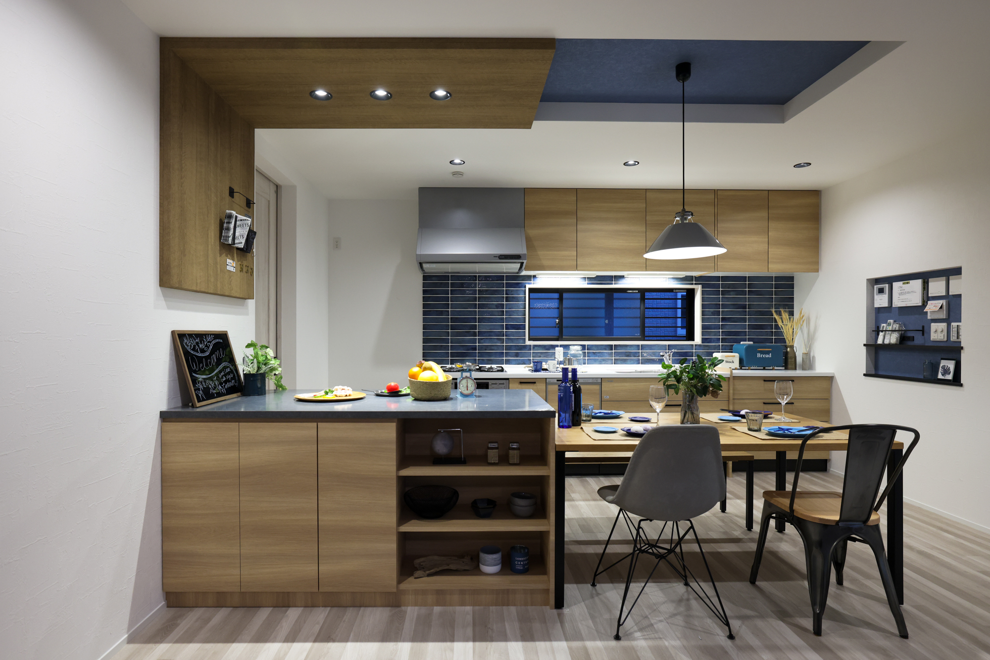 西海岸カフェスタイルのモデルハウス。ネイビーブルーとオークの木目を取り入れたカラーコーディネートをしました。