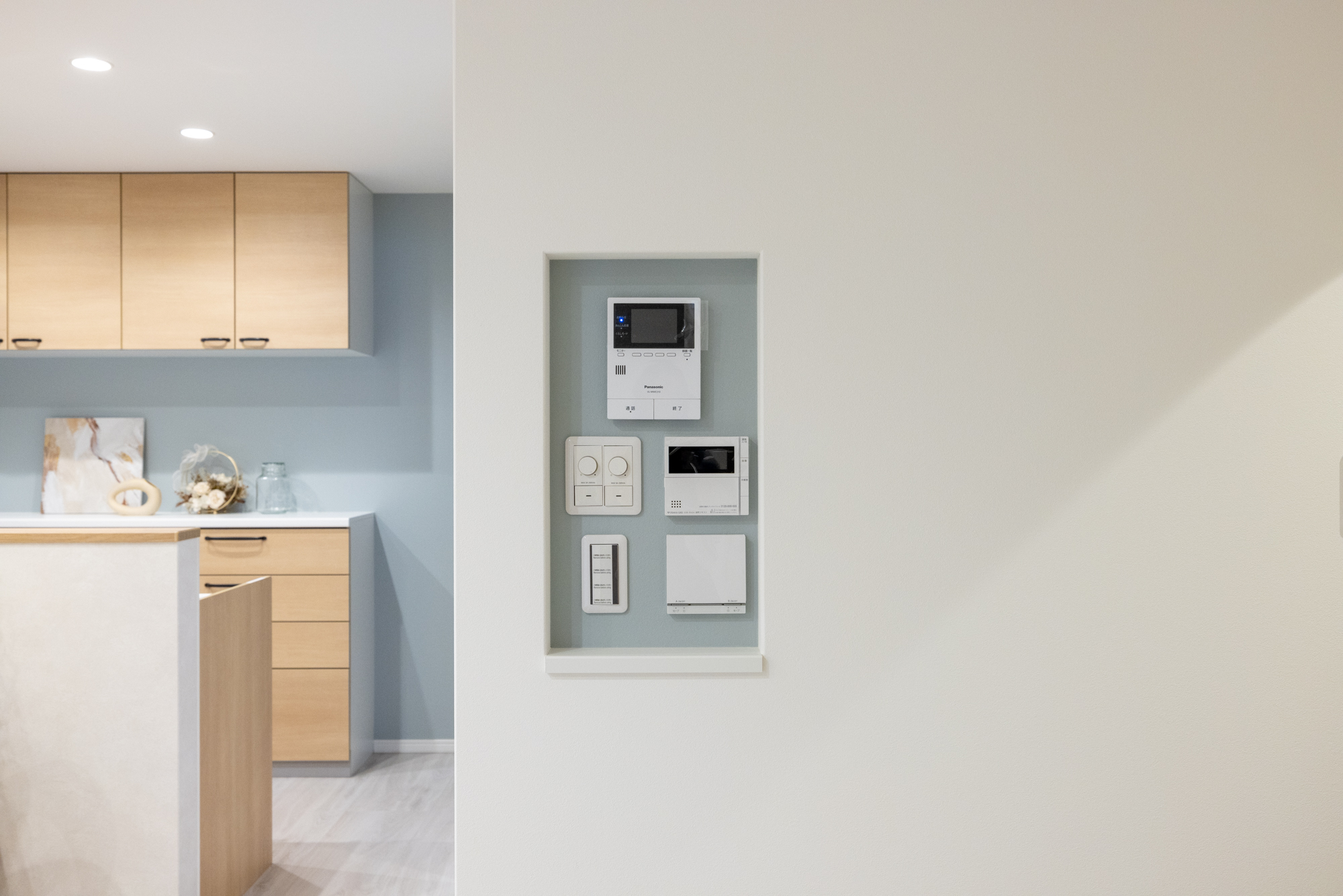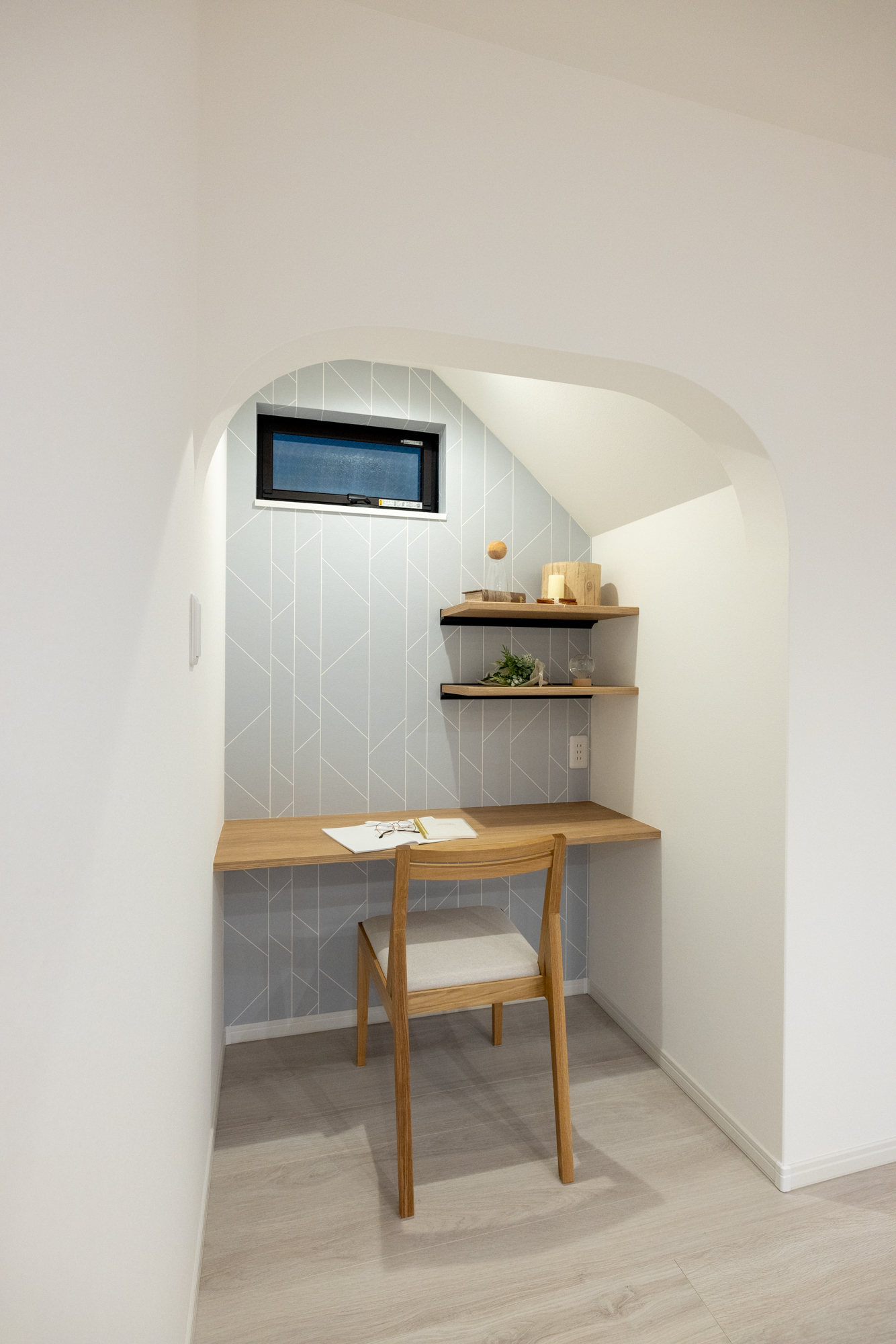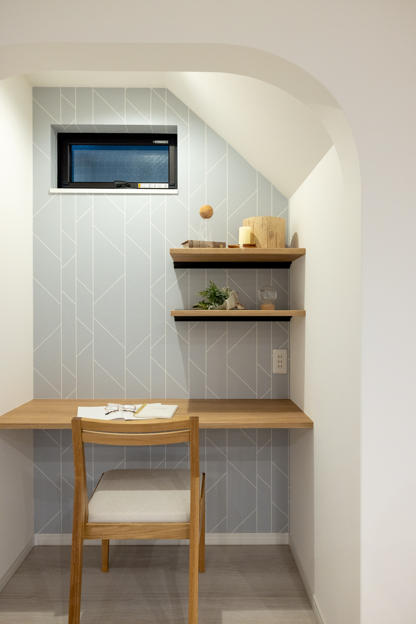さりげないニッチ、ポイントを絞ったエコカラット壁+間接照明、階段下のデスクにはR垂れ壁を設け空間をコーディネートしました。
