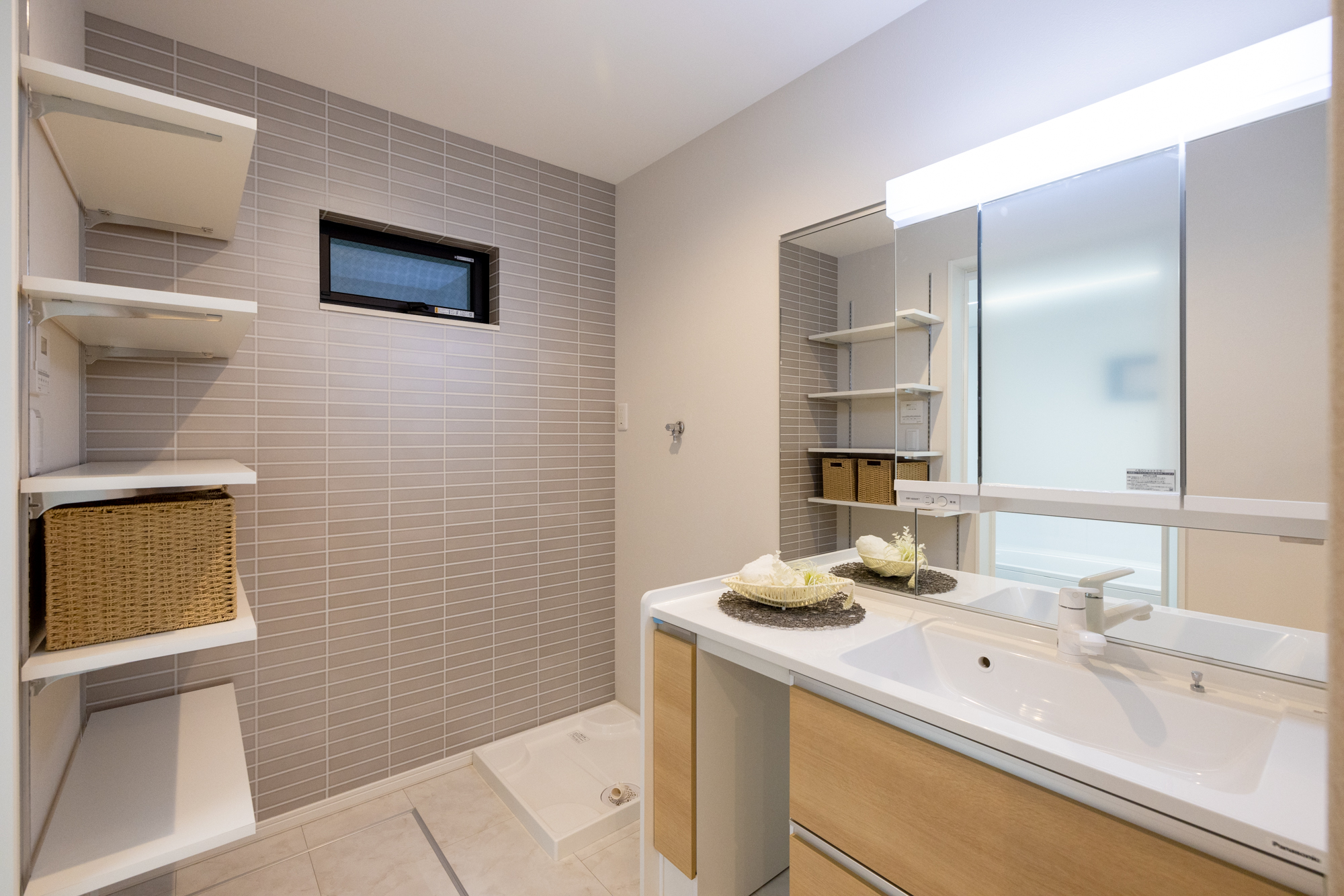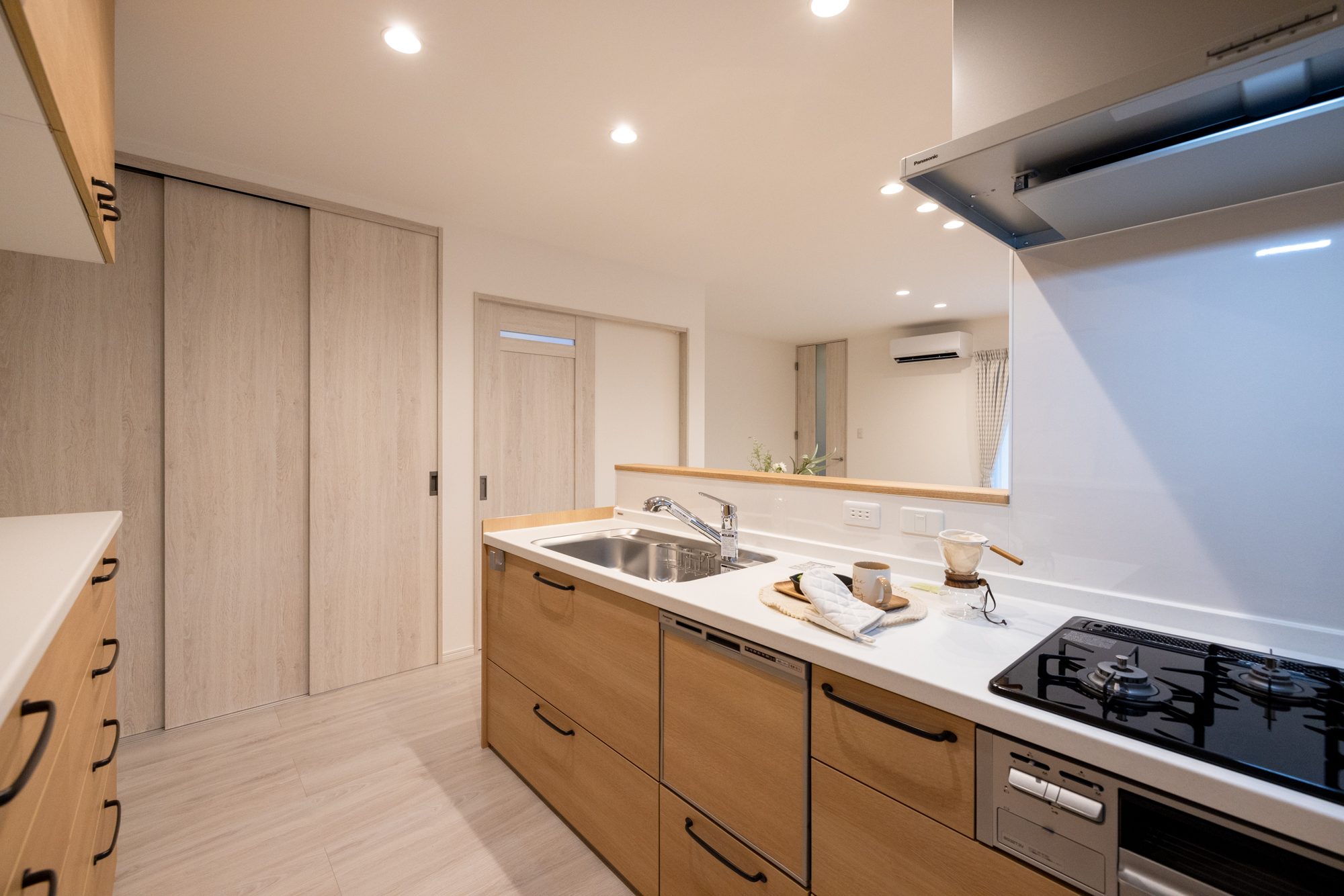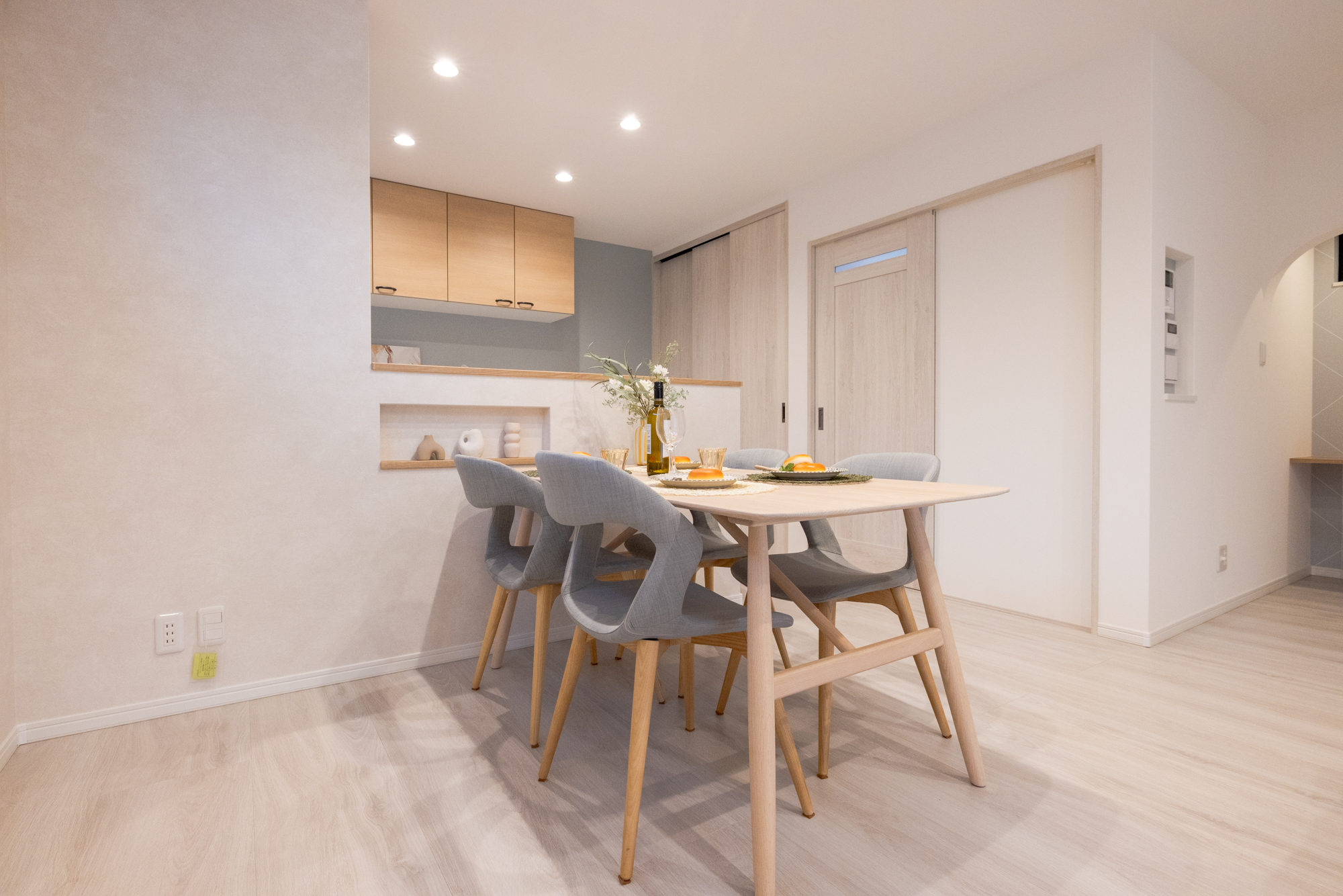 さりげないニッチ、ポイントを絞ったエコカラット壁+間接照明、階段下のデスクにはR垂れ壁を設け空間をコーディネートしました。