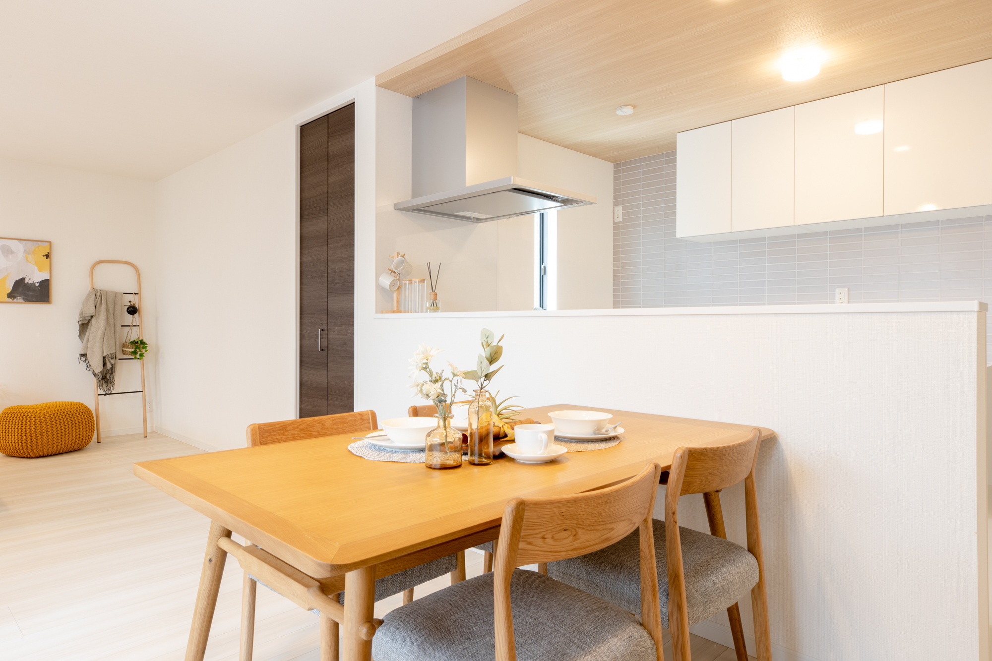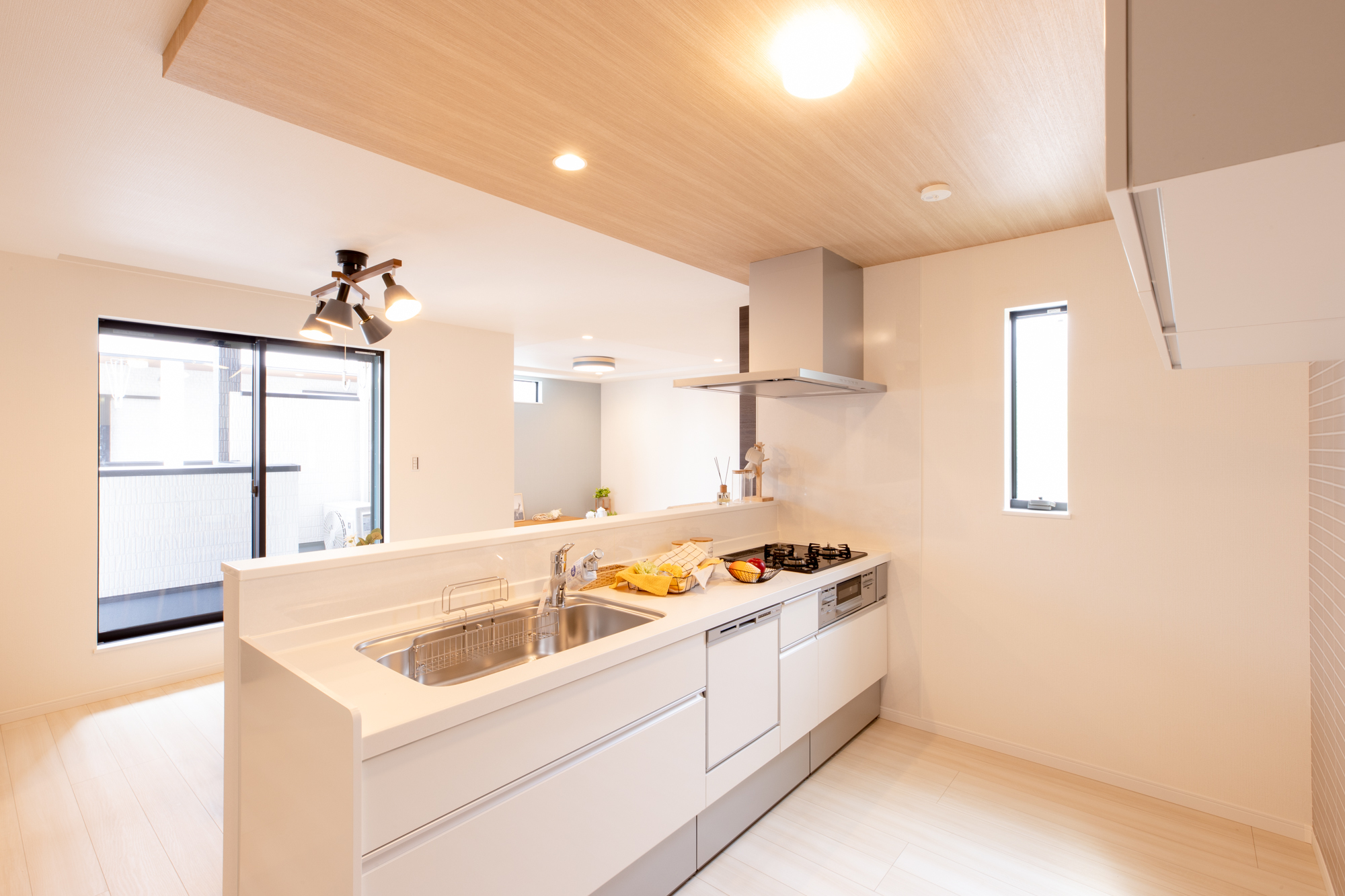 キッチンの下がり天井、アクセントのタイル調クロスの組み合わせも優しい印象です。