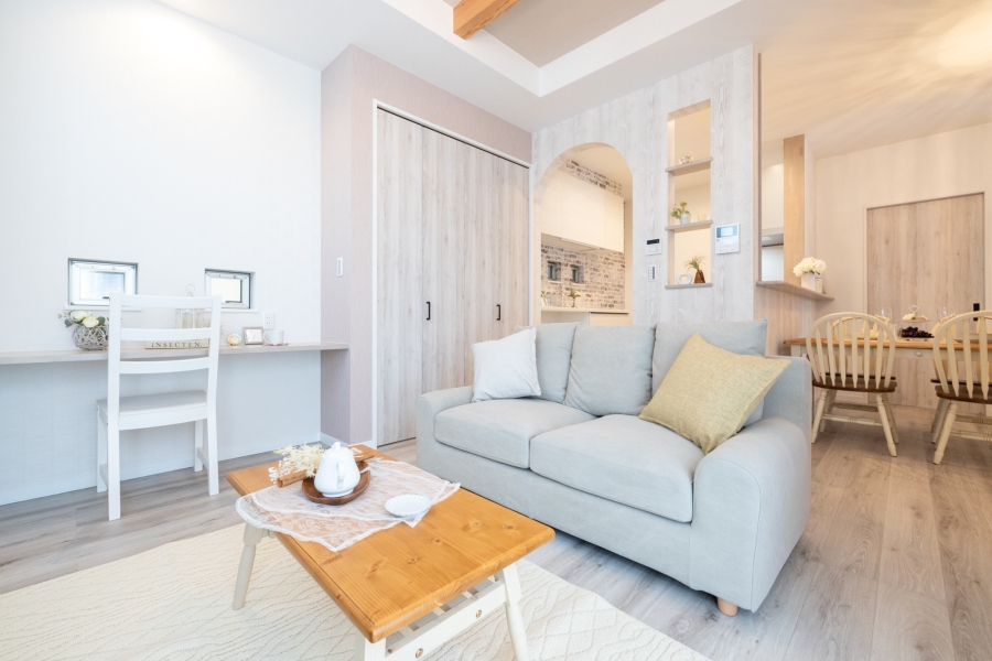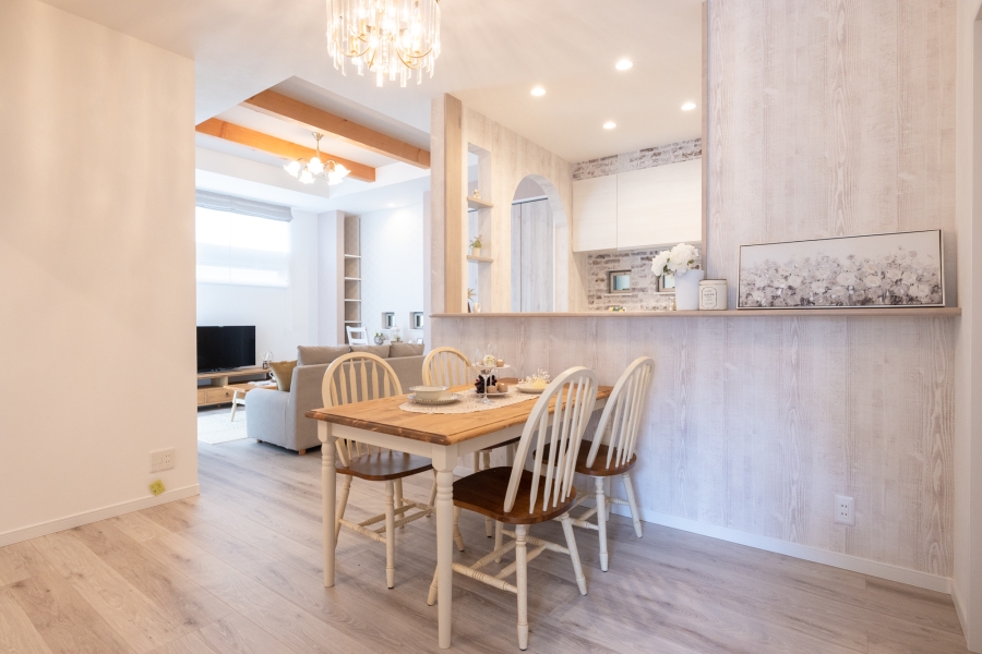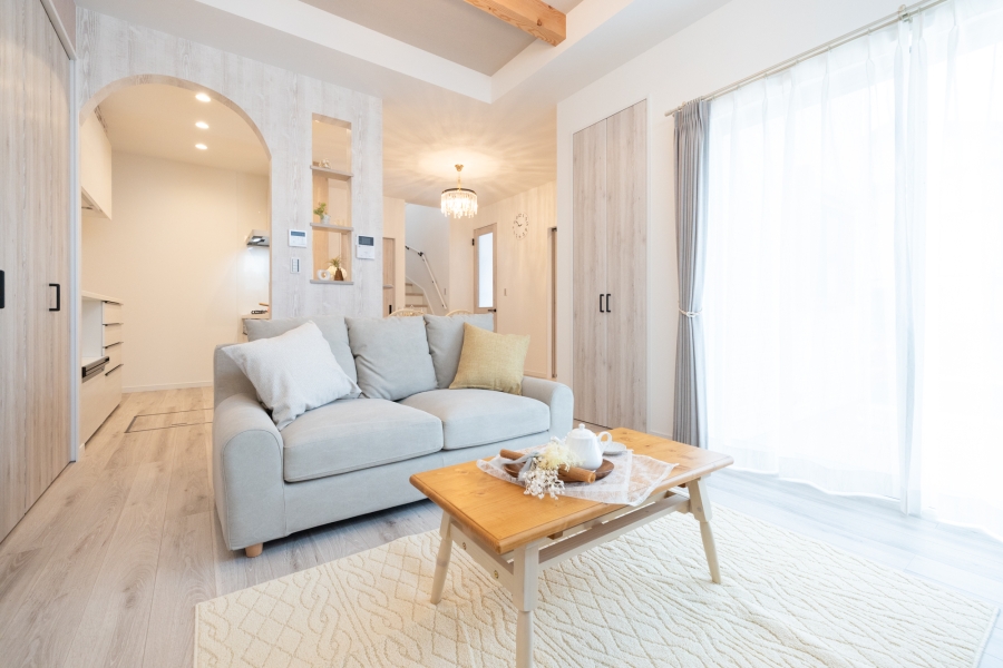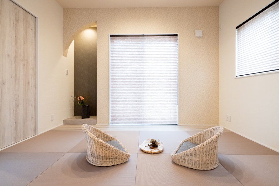アーチ型の開口や和室の垂れ壁、ニッチ等をアクセントにし、クロスは家具との組み合わせを考慮しながら綿密に計画致しました。