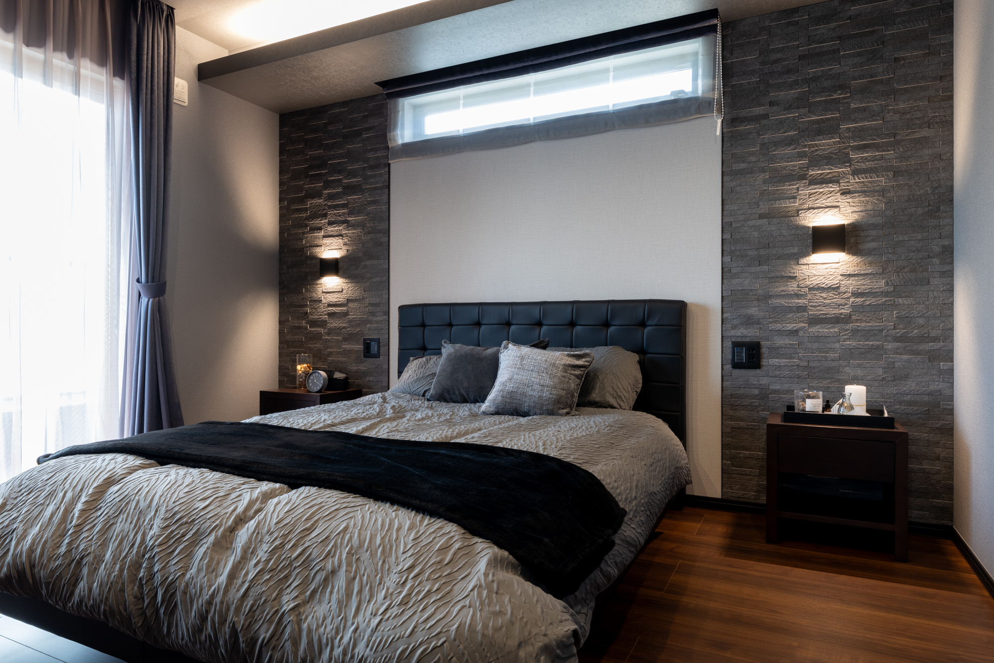 ベッドルーム、ベッドの両サイド、テレビボードの背面にはそれぞれエコカラットを採用。
