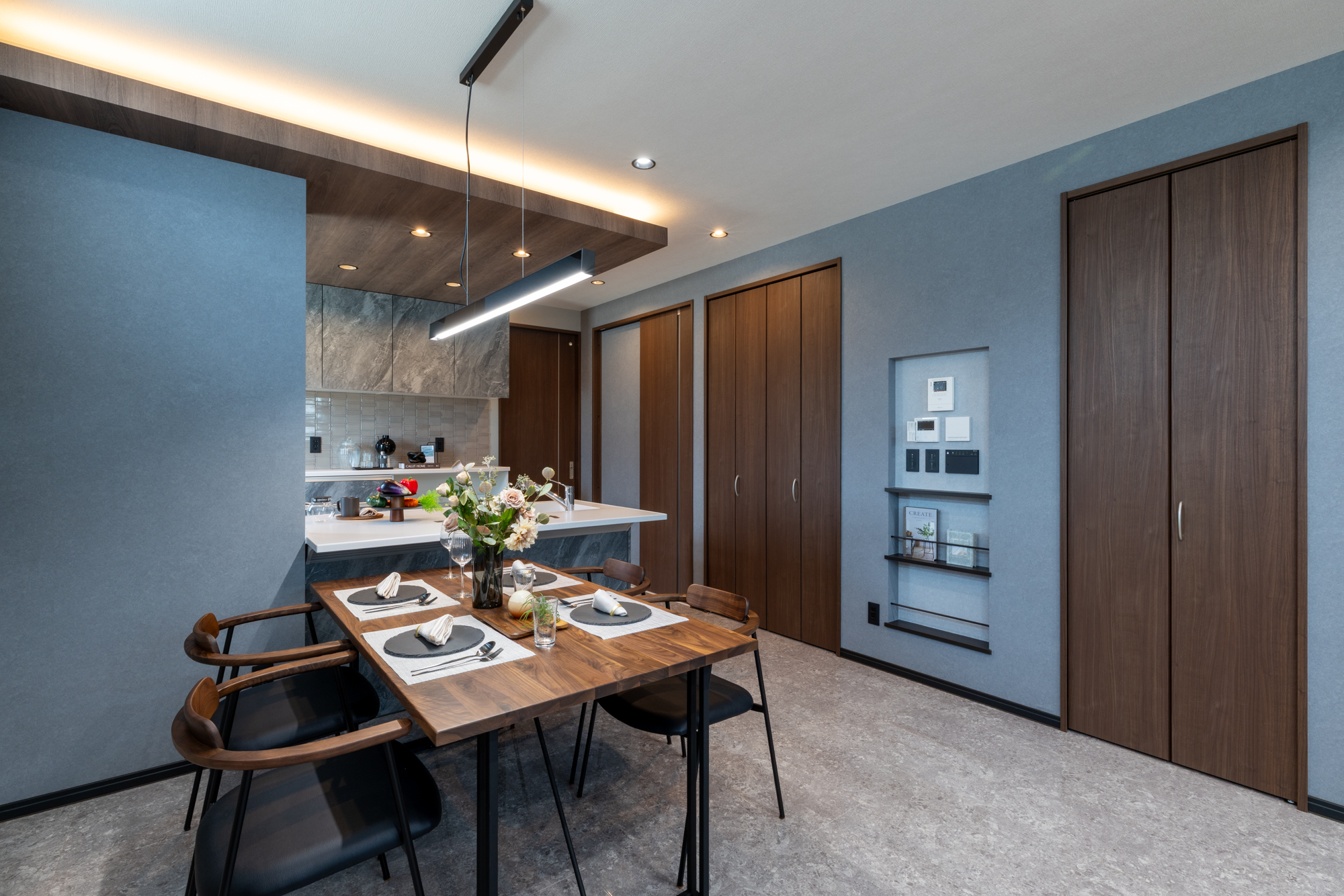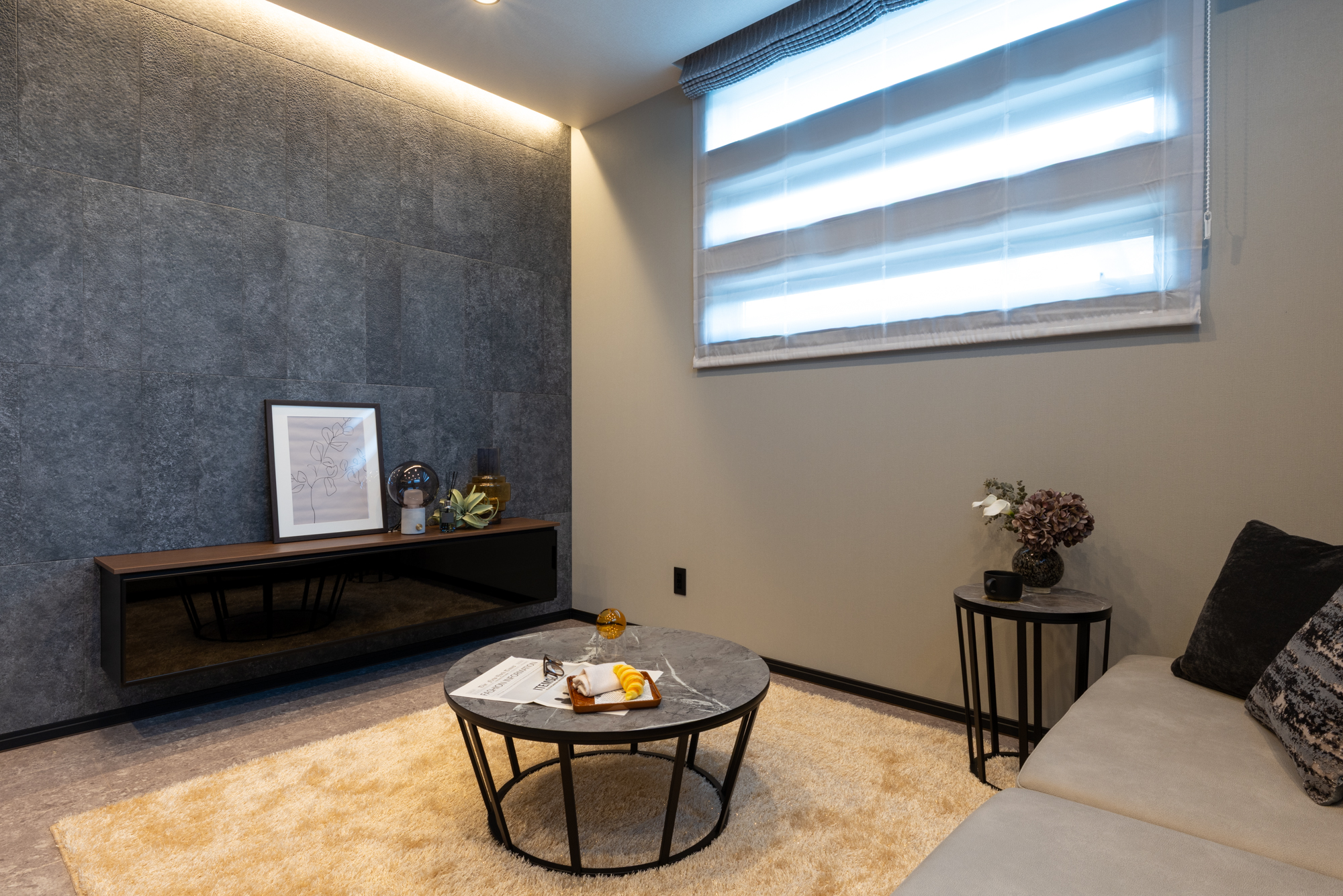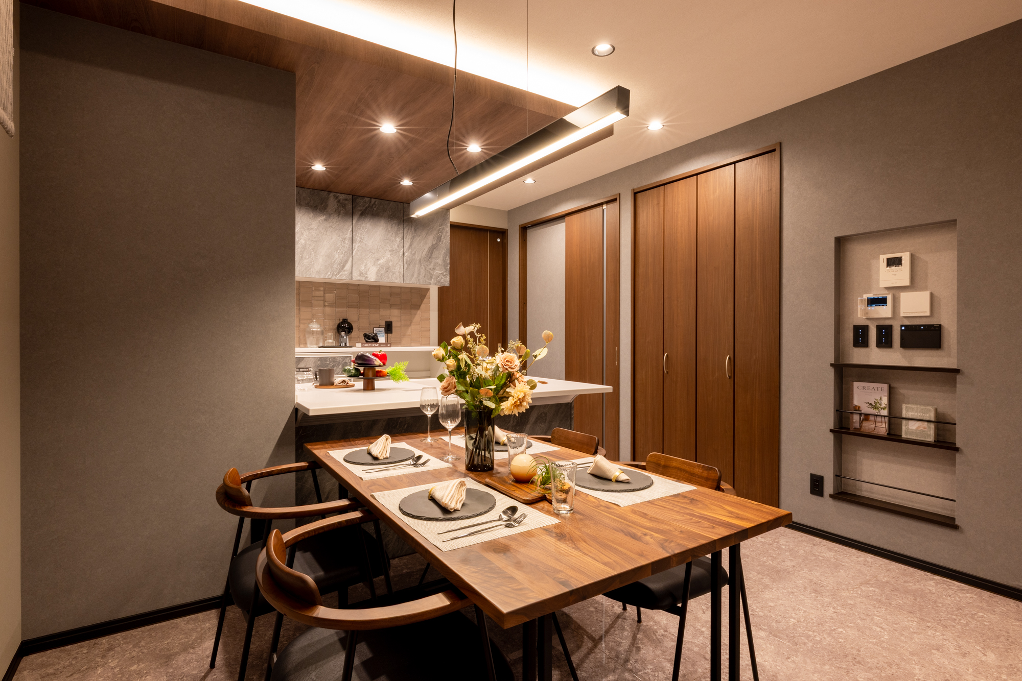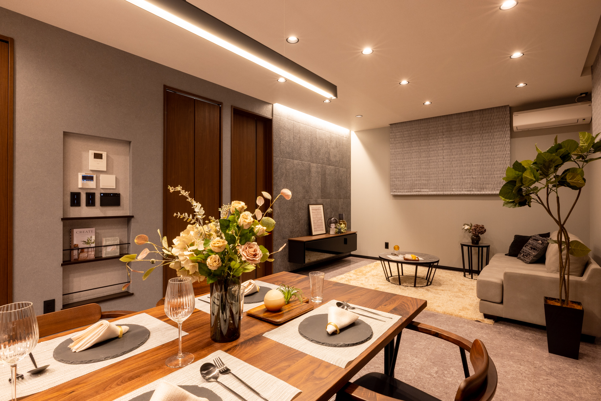 落ち着きのあるダークトーンのホテルライクインテリアを目指したモデルハウスです。