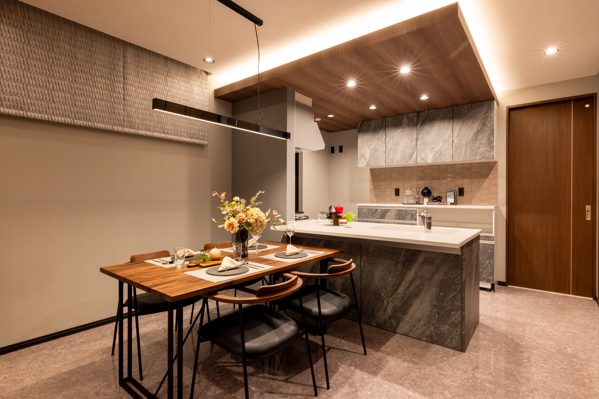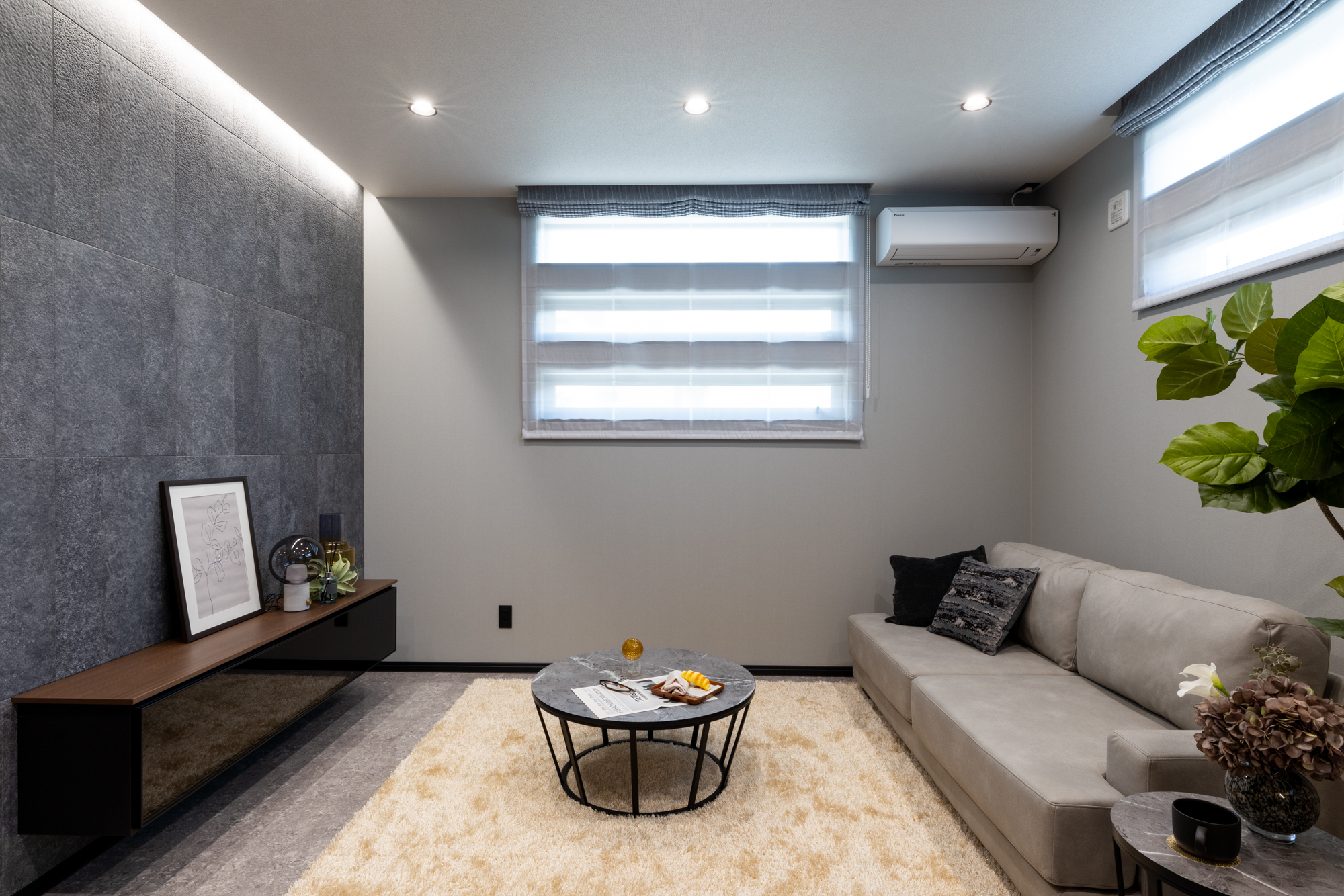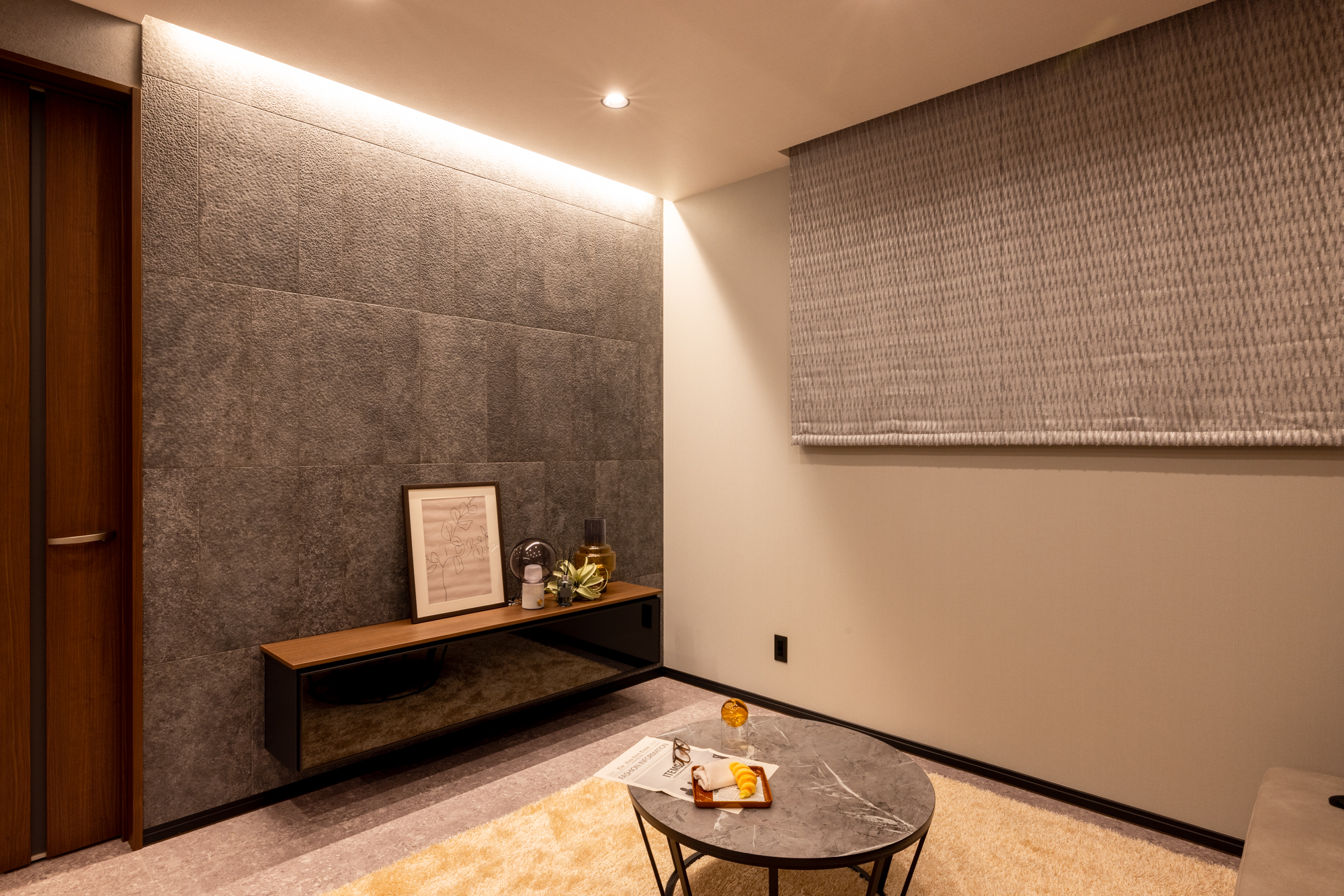 落ち着きのあるダークトーンのホテルライクインテリアを目指したモデルハウスです。