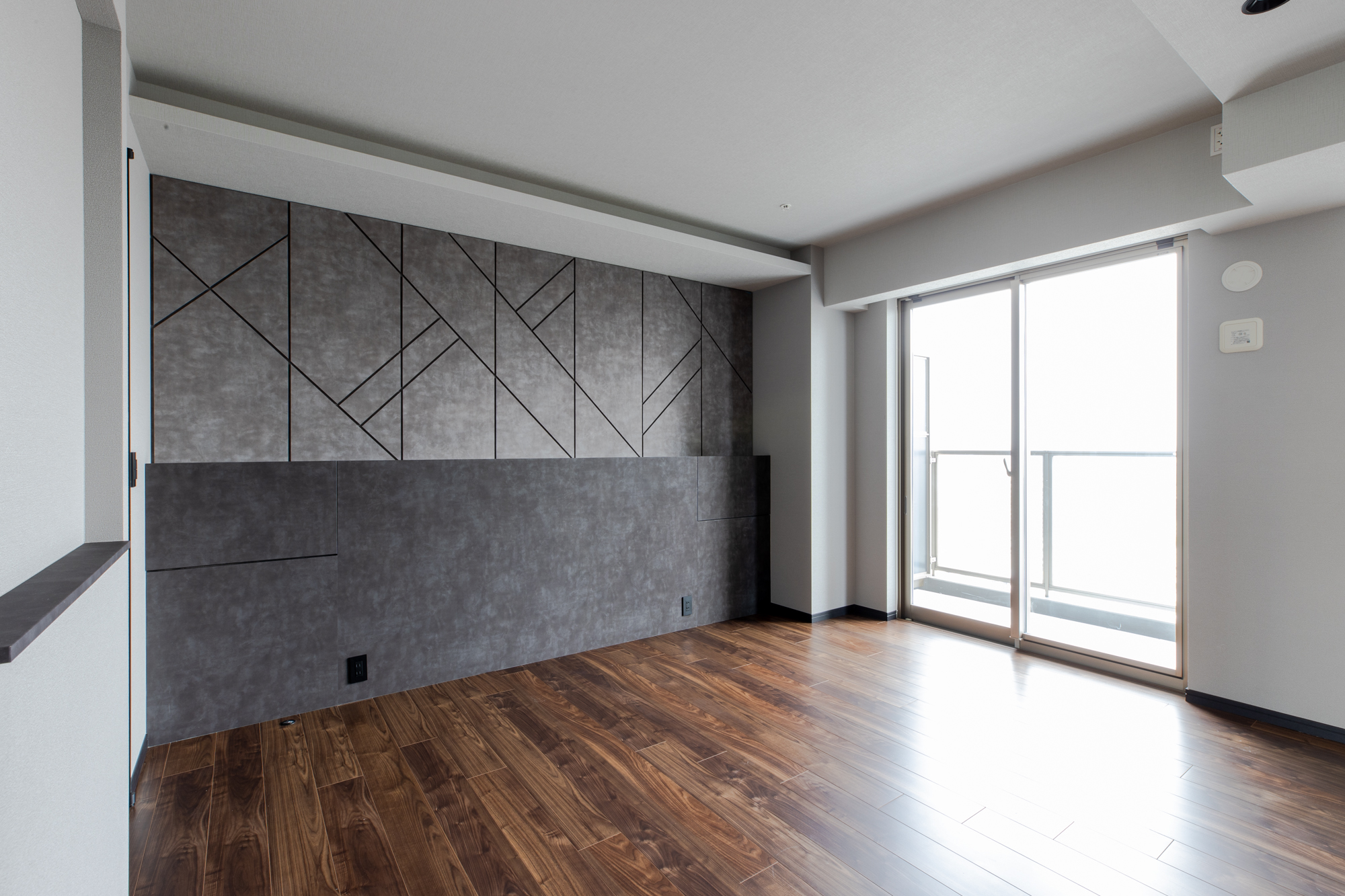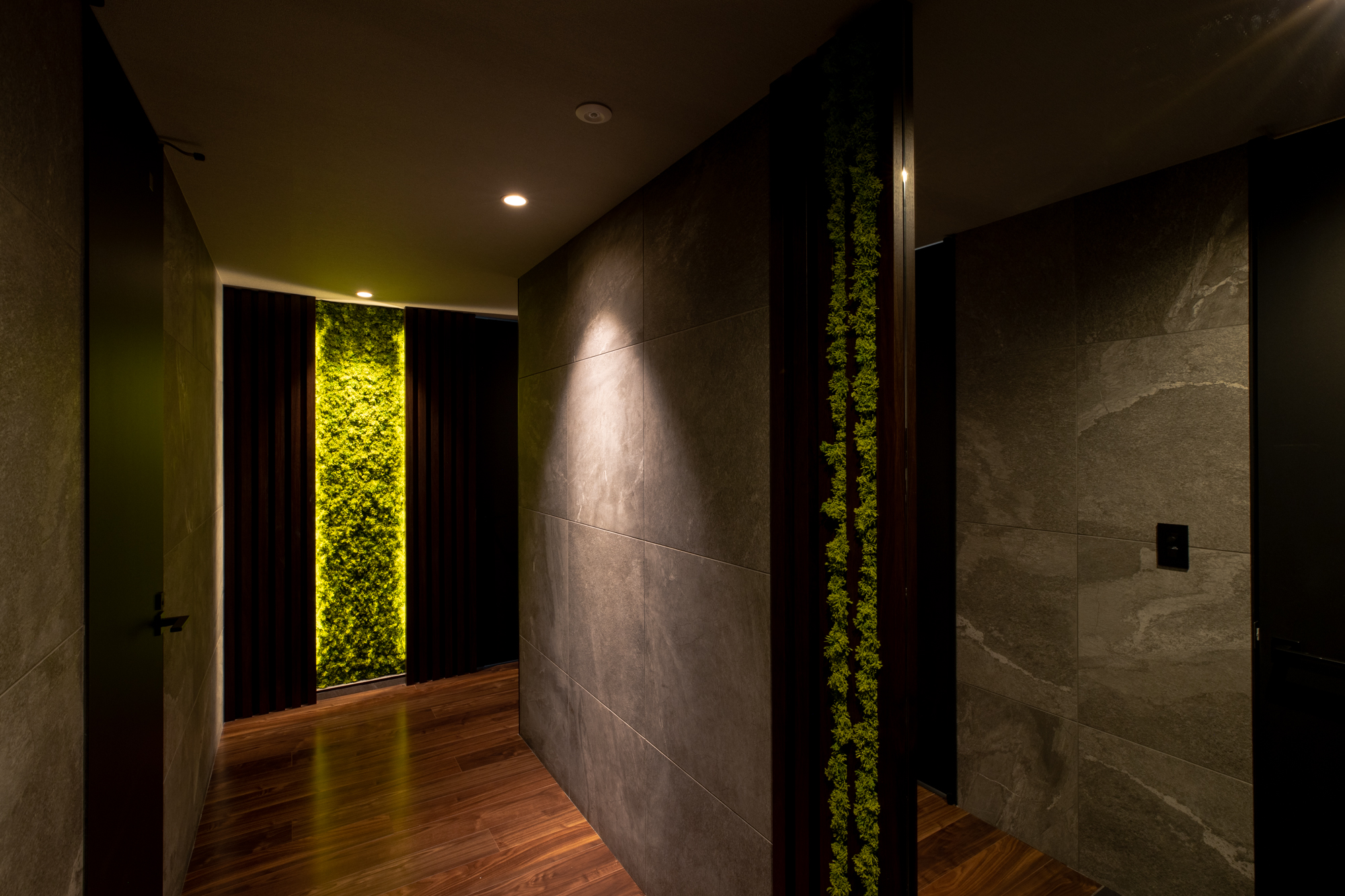 グリーンと格子を組み合わせたアクセント壁がよりホテルのような空間へと導きます。