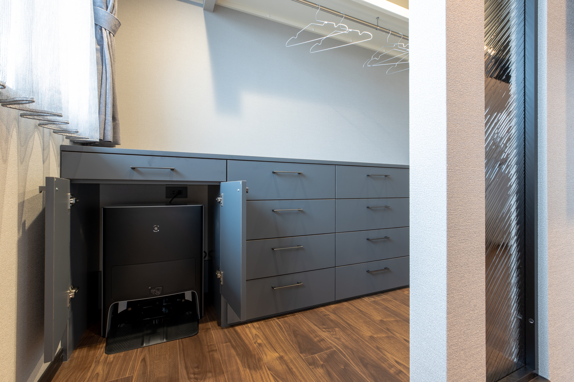 ベッドヘッドボードやテレビボード、棚、洗面室、WCL、ロボット掃除機が隠れるチェスト、アート用のニッチ等、トイレ空間、と様々な造作を凝らしました。