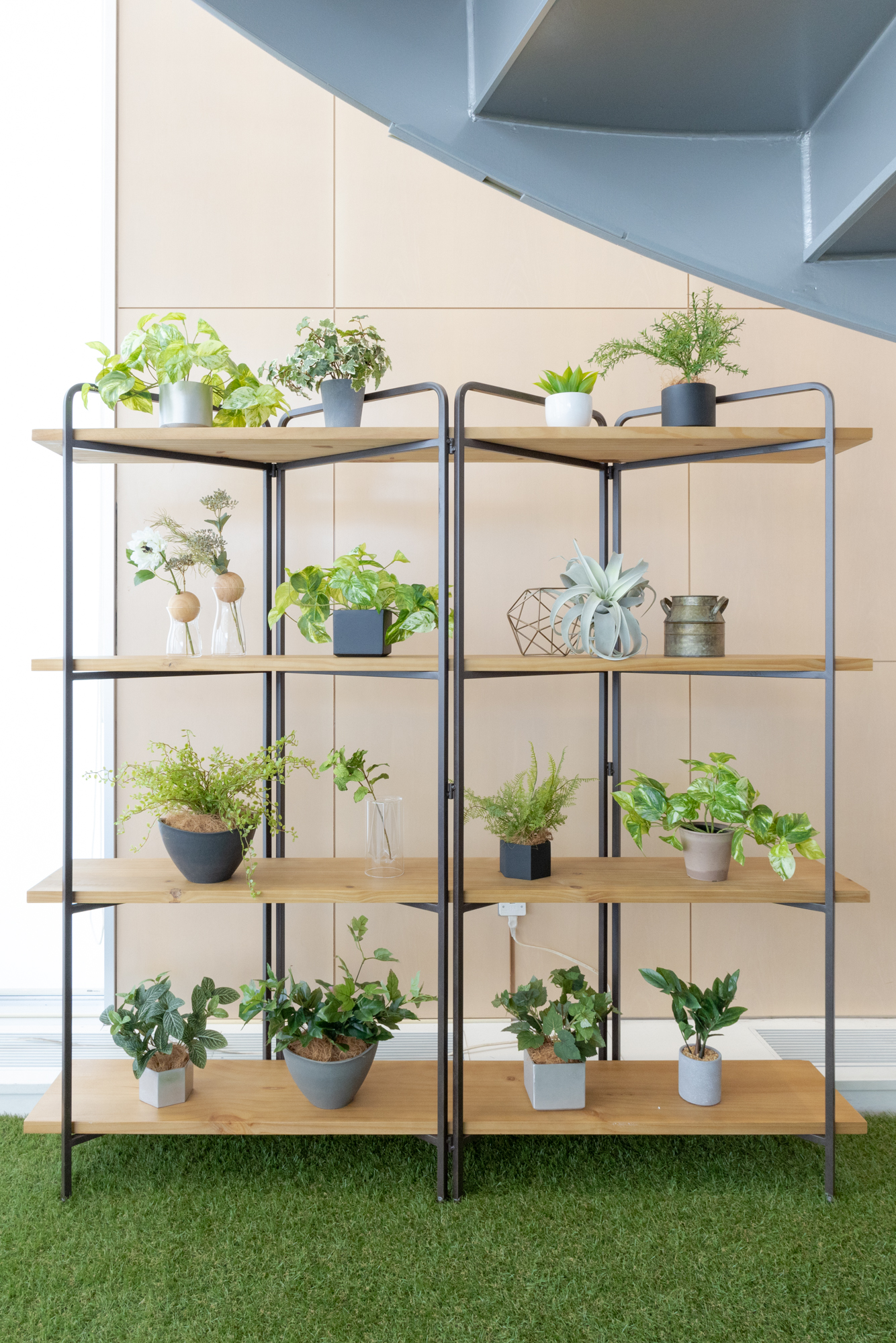 棚や、鉢を移動することが可能なので、車のショールームならではの、車の入れ替えやレイアウト替えの際にも、こちらのディスプレイを自由に動かして、レイアウトを一緒に変更していただくことが可能です。